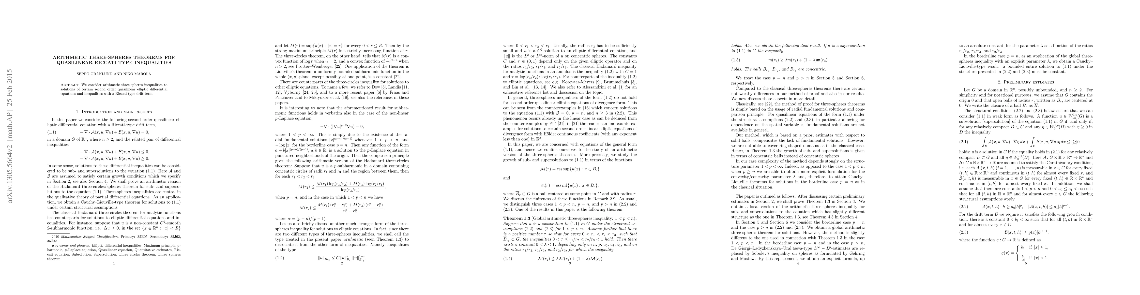 Researchers derived arithmetic three-spheres inequalities for solutions of quasilinear Riccati type differential equations, providing a new framework for solving certain elliptic equations with drift terms.