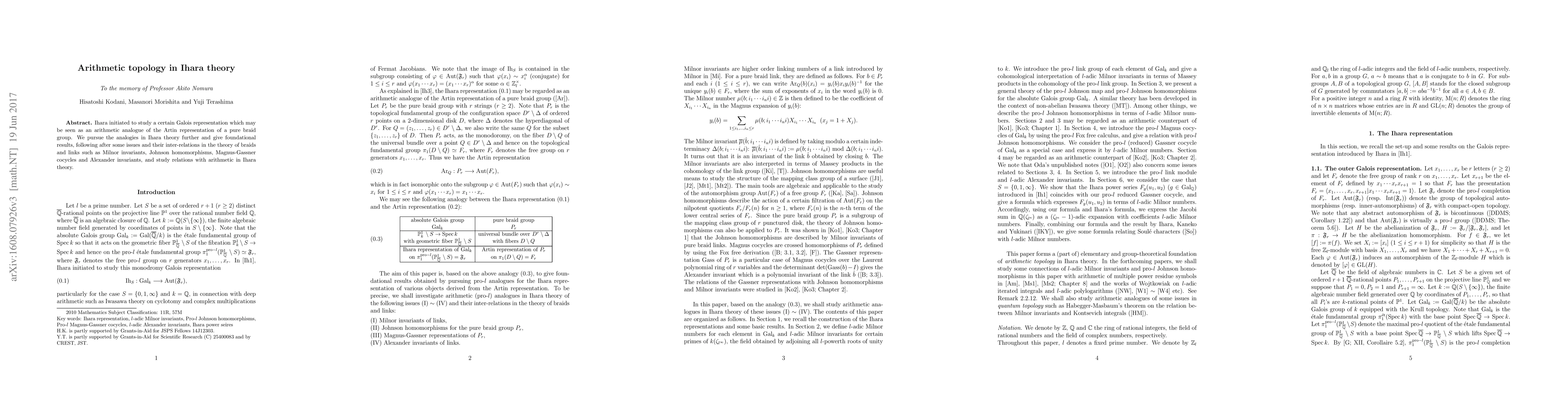 Summary: This paper explores the arithmetic analogue of the Artin representation in Ihara theory, investigating connections to braid and link theory constructs such as Milnor invariants and Johnson homomorphisms, and examining their relations to arithmetic properties.