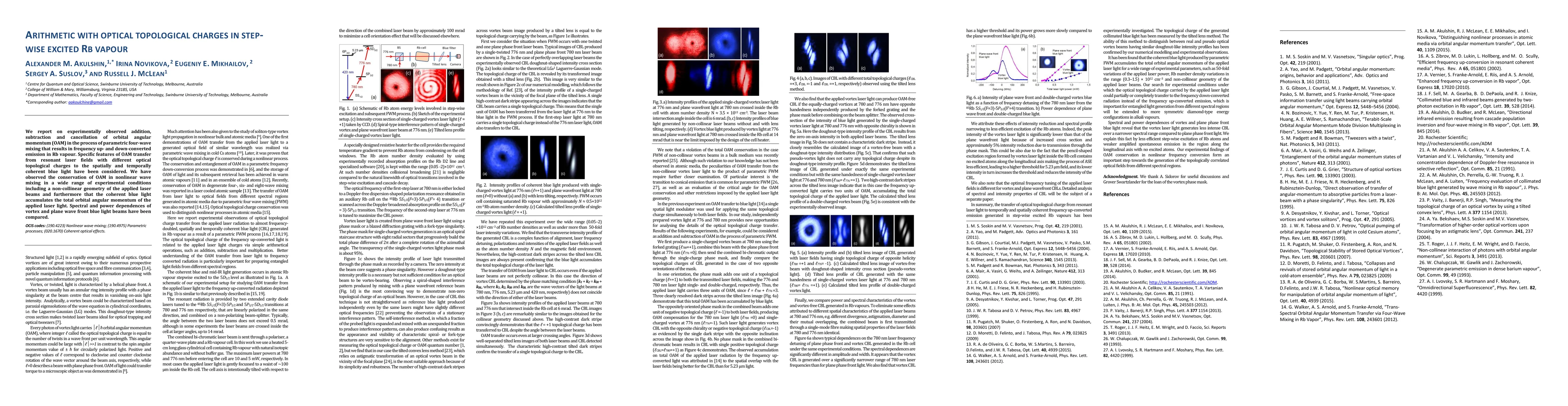 We report on experimentally observed addition, subtraction and cancellation of orbital angular momentum (OAM) in the process of parametric four-wave mixing that results in frequency up- and down-converted emission in Rb vapour. Specific features of OAM transfer from resonant laser fields with different optical topological charges to the spatially and temporally coherent blue light have been considered. We have observed the conservation of OAM in nonlinear wave mixing in a wide range of experimental conditions including a non-collinear geometry of the applied laser beams and furthermore that the coherent blue light accumulates the total orbital angular momentum of the applied laser light. Spectral and power dependences of vortex and plane wave front blue light beams have been compared.