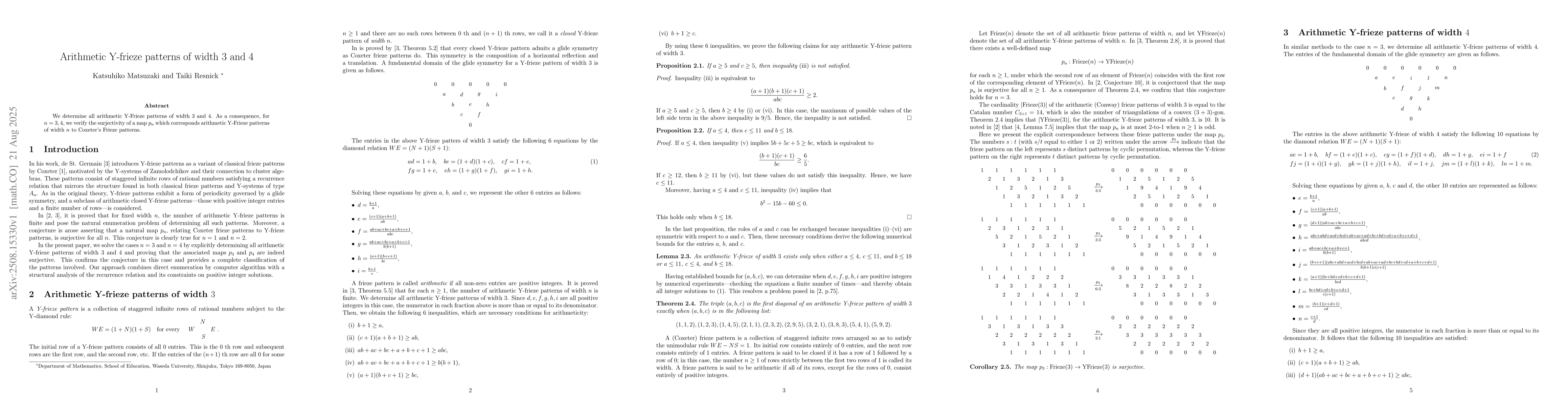 We determine all arithmetic Y-Frieze patterns of width $3$ and $4$. As a consequence, for $n=3,4$, we verify the surjectivity of a map $p_n$ which corresponds arithmetic Y-Frieze patterns of width $n$ to Coxeter's Frieze patterns.