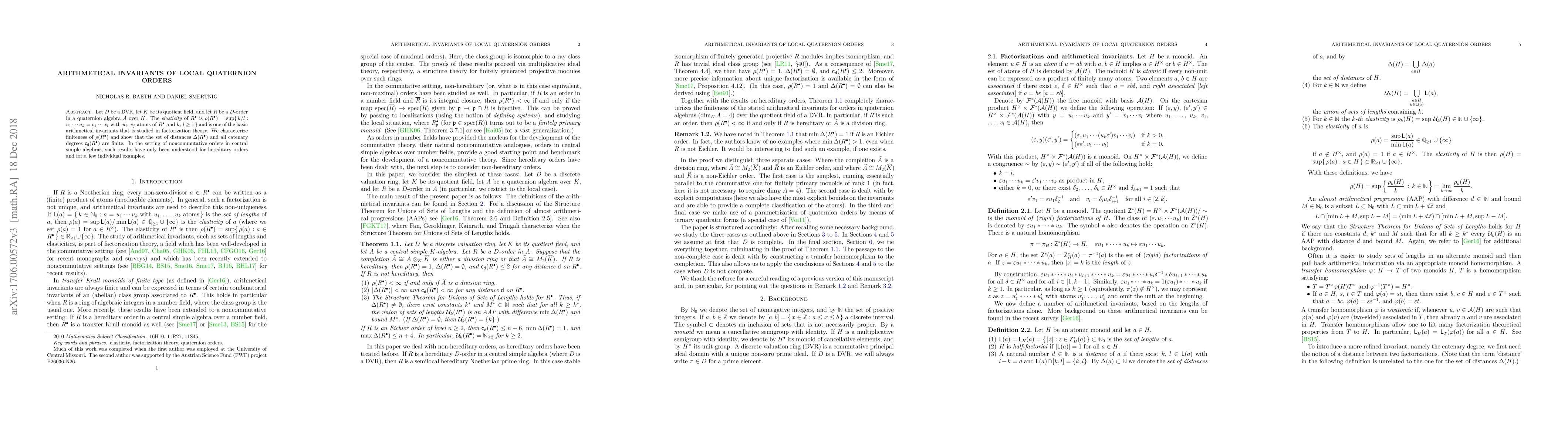 This paper investigates the elasticity $\rho(R^\bullet)$ and other arithmetical invariants of local quaternion orders $R$ in a quaternion algebra $A$ over a DVR $D$. It establishes the finiteness of $\rho(R^\bullet)$, $\Delta(R^\bullet)$, and all catenary degrees $\mathsf c_\mathsf d(R^\bullet)$, extending understanding beyond hereditary orders.