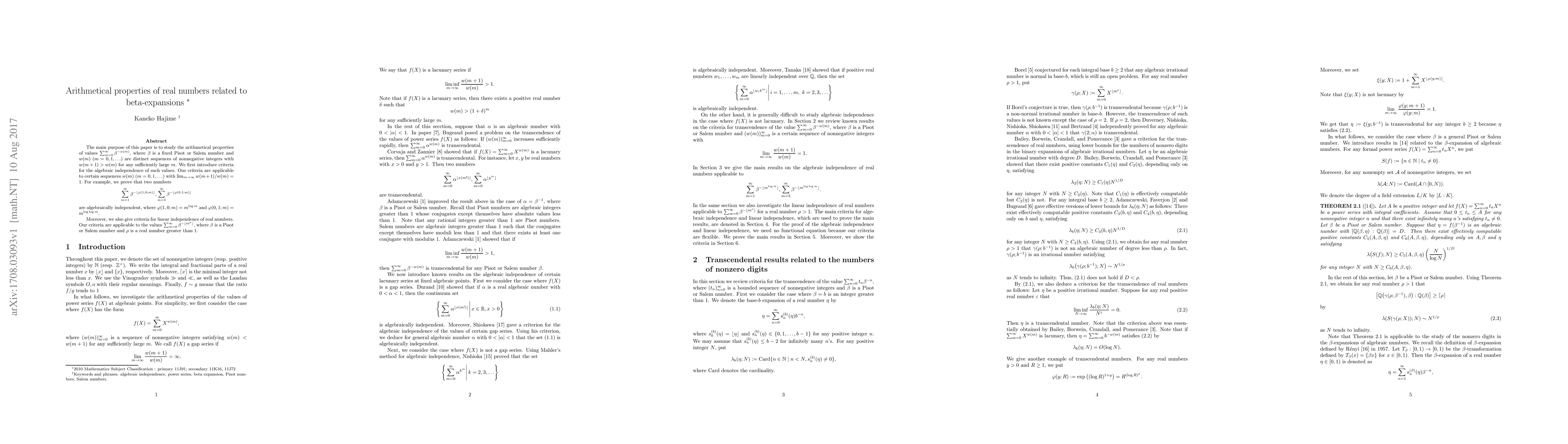 This paper studies arithmetical properties of real numbers related to beta-expansions, providing criteria for algebraic and linear independence, and implications for certain sequences with a specific growth rate limit.