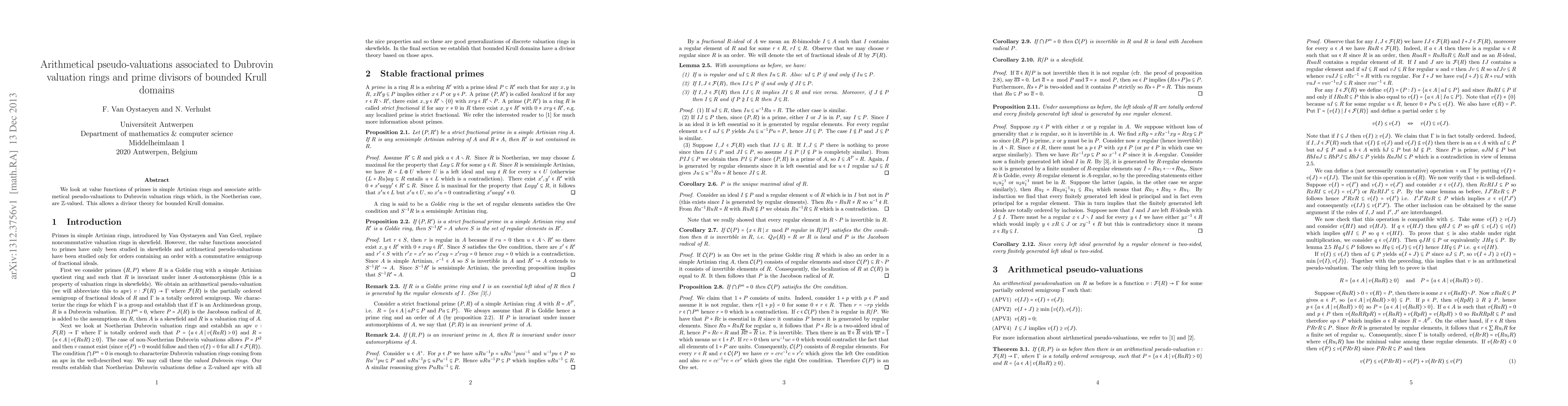 We look at value functions of primes in simple Artinian rings and associate arithmetical pseudo-valuations to Dubrovin valuation rings which, in the Noetherian case, are $\mathbb{Z}$-valued. This allows a divisor theory for bounded Krull domains.