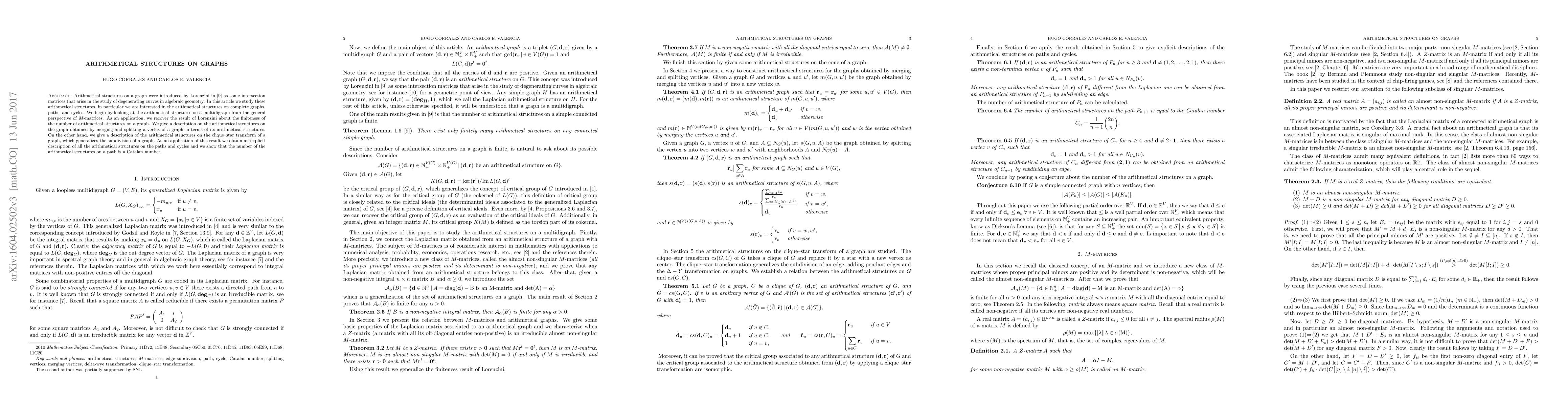 Arithmetical structures on a graph were introduced by Lorenzini as some intersection matrices that arise in the study of degenerating curves in algebraic geometry. In this article we study these arithmetical structures, in particular we are interested in the arithmetical structures on complete graphs, paths, and cycles. We begin by looking at the arithmetical structures on a multidigraph from the general perspective of $M$-matrices. As an application, we recover the result of Lorenzini about the finiteness of the number of arithmetical structures on a graph. We give a description on the arithmetical structures on the graph obtained by merging and splitting a vertex of a graph in terms of its arithmetical structures. On the other hand, we give a description of the arithmetical structures on the clique--star transform of a graph, which generalizes the subdivision of a graph. As an application of this result we obtain an explicit description of all the arithmetical structures on the paths and cycles and we show that the number of the arithmetical structures on a path is a Catalan number.