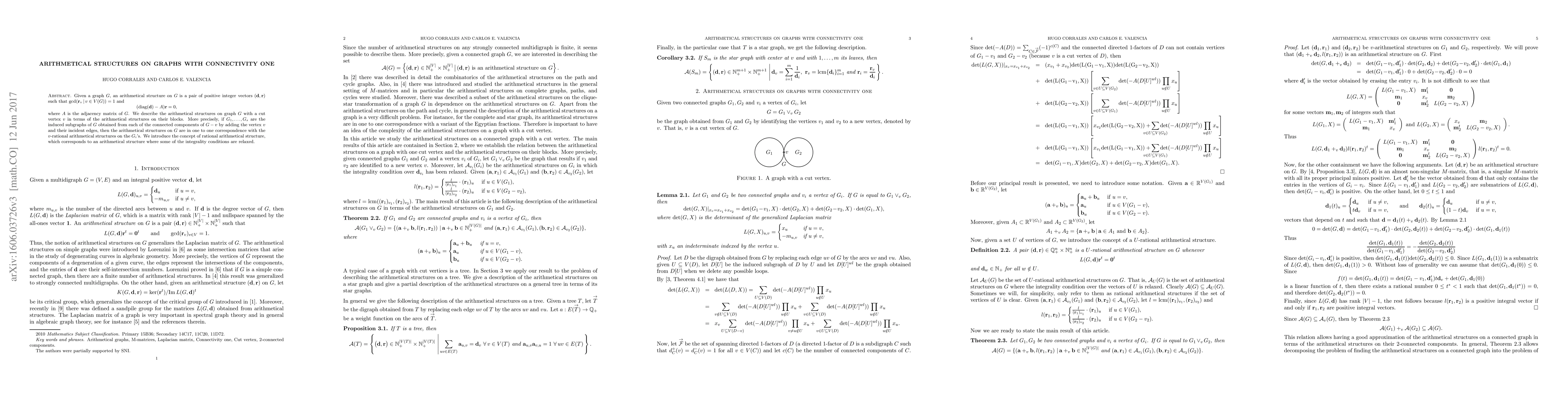 This paper explores arithmetical structures on graphs with connectivity one, defined by specific integer vectors satisfying a diophantine equation involving the graph's adjacency matrix. It establishes a correspondence between these structures on a graph with a cut vertex and its connected components, introducing the concept of rational arithmetical structures for cases where integrality conditions are relaxed.