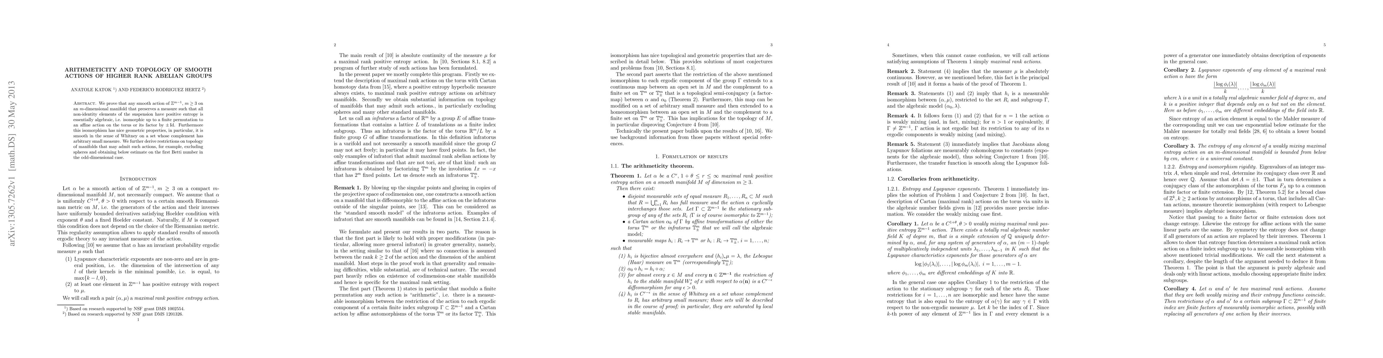 We prove that any smooth action of $\mathbb Z^{m-1}, m\ge 3$ on an $m$-dimensional manifold that preserves a measure such that all non-identity elements of the suspension have positive entropy is essentially algebraic, i.e. isomorphic up to a finite permutation to an affine action on the torus or its factor by $\pm\Id$. Furthermore this isomorphism has nice geometric properties, in particular, it is smooth in the sense of Whitney on a set whose complement has arbitrary small measure. We further derive restrictions on topology of manifolds that may admit such actions, for example, excluding spheres and obtaining below estimate on the first Betti number in the odd-dimensional case.