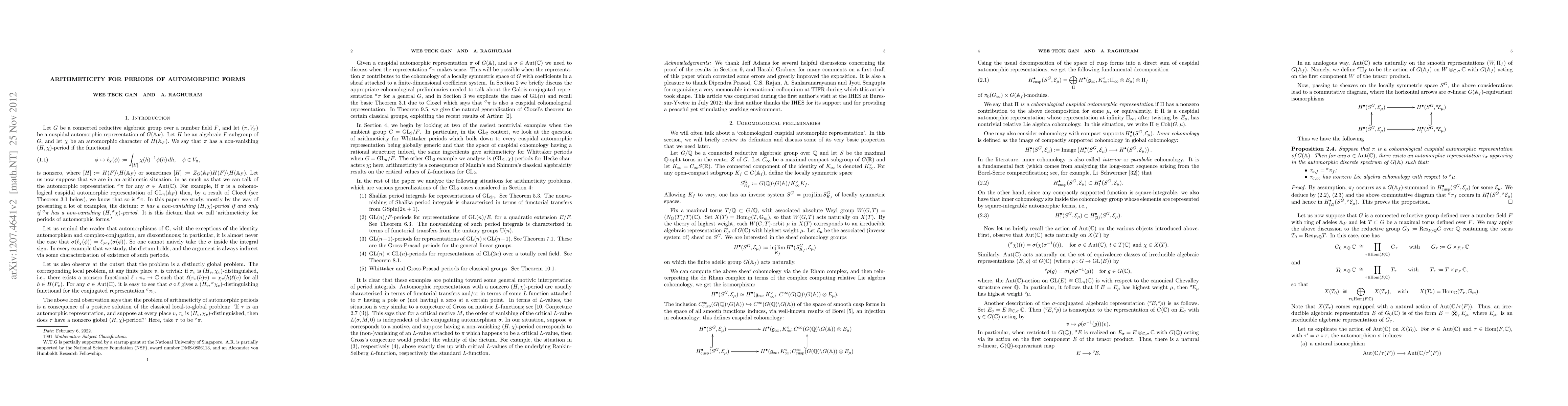 A cuspidal automorphic representation \pi of a group G is said to to be distinguished with respect to a subgroup H if the integral of f along H is nonzero for a cusp form f in the space of \pi. Such period integrals are related to (non)vanishing of interesting L-values and also to Langlands functoriality. This article discusses a general principle, labelled arithmeticity, which roughly states that "\pi is H-distinguished if and only if any Galois conjugate of \pi is H-distinguished." We study this principle via several examples; starting with GL(2) and leading up to more complicated situations where the ambient group is a higher GL(n) or a classical group.