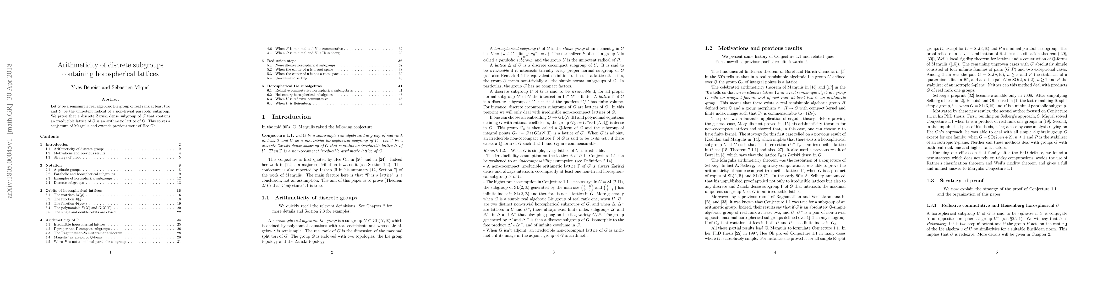 Let $G$ be a semisimple real algebraic Lie group of real rank at least two and $U$ be the unipotent radical of a non-trivial parabolic subgroup. We prove that a discrete Zariski dense subgroup of $G$ that contains an irreducible lattice of $U$ is an arithmetic lattice of $G$. This solves a conjecture of Margulis and extends previous work of Hee Oh.