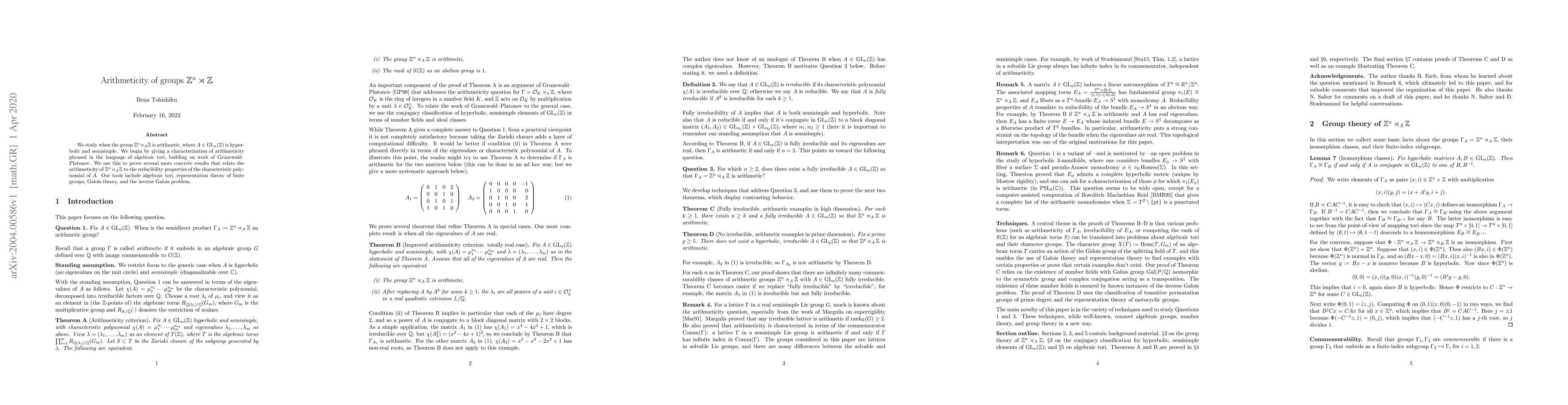 The research employs algebraic geometry, representation theory, Galois theory, and the inverse Galois problem to study the arithmeticity of groups $\mathbb Z^n\rtimes\mathbb Z$ where $A \in GL_n(\mathbb Z)$ is hyperbolic and semisimple.