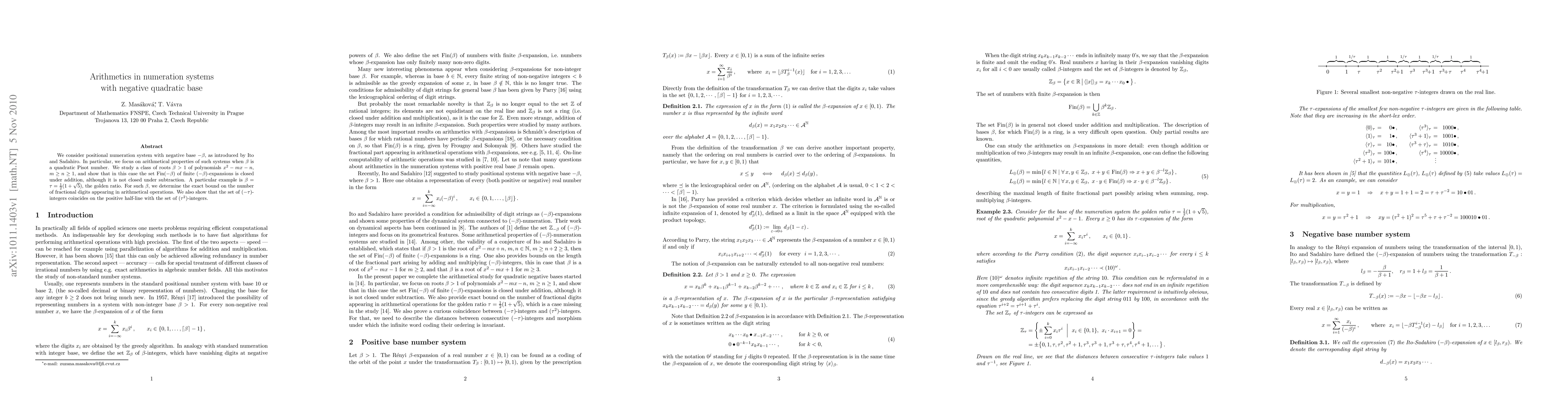This paper investigates arithmetic properties in numeration systems with negative quadratic base, focusing on a class of roots that lead to certain closure properties under addition and subtraction. It also explores the relationship between integers in these systems and their equivalents in other bases.