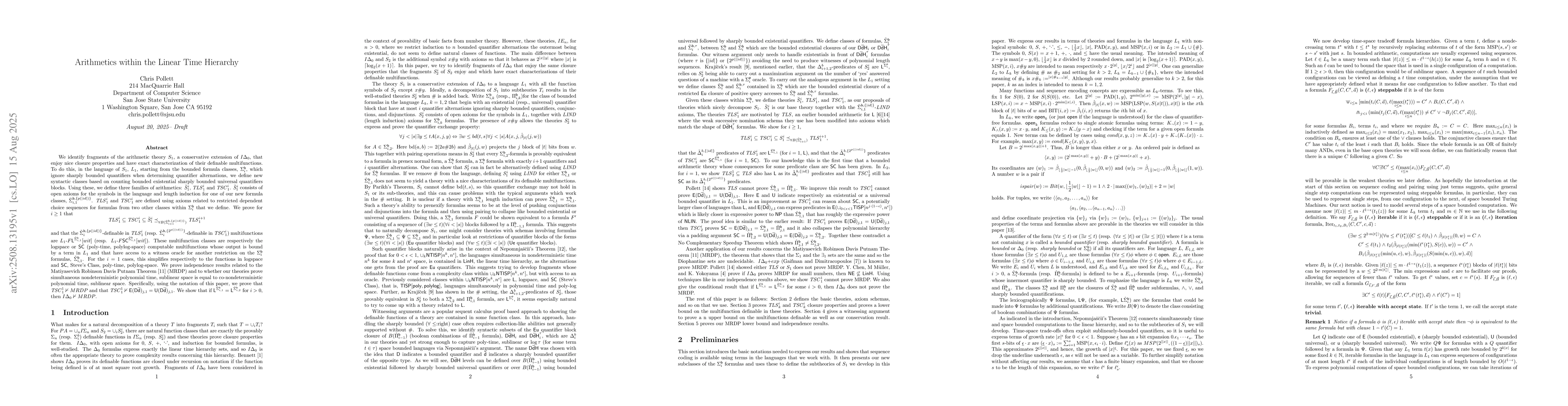 We identify fragments of the arithmetic $S_1$ that enjoy nice closure properties and have exact characterization of their definable multifunctions. To do this, in the language of $S_1$, $L_1$, starting from the formula classes, $\Sigma^{\mathsf b}_{i}$, which ignore sharply bounded quantifiers when determining quantifier alternations, we define new syntactic classes by counting bounded existential sharply bounded universal quantifiers blocks. Using these, we define arithmetics: $\breve{S}^{i}_{1}$, $TLS^i_1$ and $TSC^i_1$. $\breve{S}^{i}_{1}$ consists of open axioms for the language symbols and length induction for one of our new classes, $SIUT_{i,1}^{\{p(|id|)\}}$. $TLS^i_1$ and $TSC^i_1$ are defined using axioms related to dependent choice sequences for formulas from two other classes within $\Sigma^{\mathsf b}_{i}$. We prove for $i \geq 1$ that $$TLS^i_1 \subseteq TSC^i_1 \subseteq \breve{S}^{i}_{1} \preceq_{\forall B(SITT_{i+1}^{\{p(|id|)\}})} TLS^{i+1}_1$$ and that the $SITT_{i}^{\{p(|id|)\}}$-definable in $TLS^i_1$ (resp. $SITT_{i}^{\{2^{p(||id||)}\}}$-definable in $TSC^i_1$) multifunctions are $L_1$-$FLOGSPACE^{SIT_{i,1}}[wit]$ (resp. $L_1$-$FSC^{SIT_{i,1}}[wit]$). These multifunction classes are respectively the logspace or $SC$ (poly-time, polylog-space) computable multifunctions whose output is bound by a term in $L_1$ and that have access to a witness oracle for another restriction on the $\Sigma^{\mathsf b}_{i}$ formulas, $SIT_{i,1}$. For the $i=1$ cases, this simplifies respectively to the functions in logspace and $SC$, Steve's Class, poly-time, polylog-space. We prove independence results related to the Matiyasevich Robinson Davis Putnam Theorem (MRDP) and to whether our theories prove simultaneous nondeterministic polynomial time, sublinear space is equal to co-nondeterministic polynomial time, sublinear space.