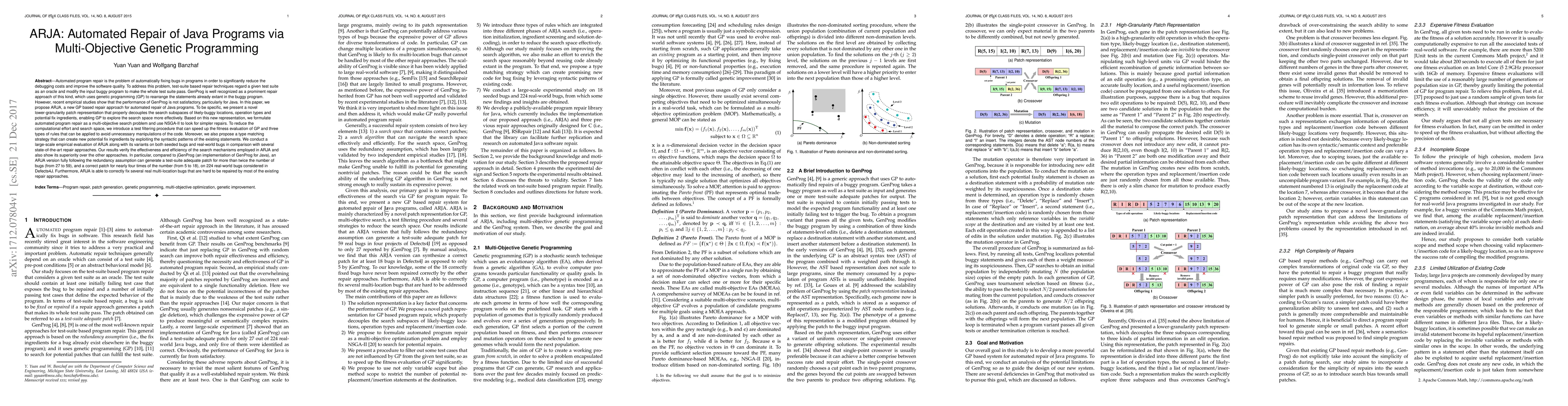 ARJA is a novel multi-objective genetic programming approach for automated repair of Java programs, featuring a lower-granularity patch representation and NSGA-II for simpler repairs. Empirical evaluation shows ARJA outperforms existing methods, fixing more bugs and handling complex multi-location issues effectively.