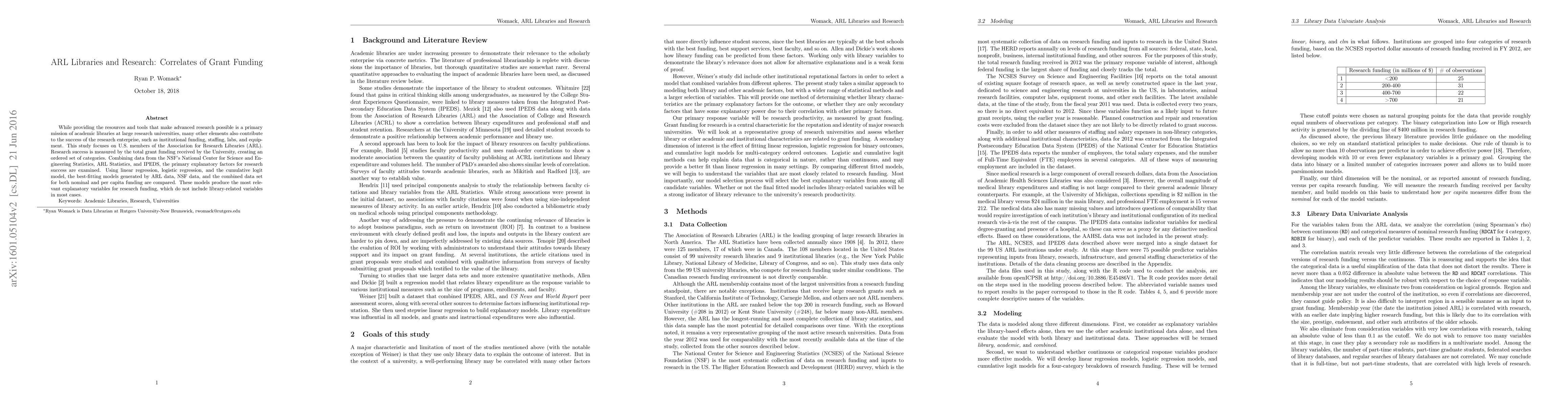 This study examines factors influencing grant funding success among U.S. members of the Association for Research Libraries (ARL), finding that institutional funding, staffing, labs, and equipment are primary explanatory variables, rather than library-related factors. The research uses regression models to compare funding data from NSF, ARL, and IPEDS.