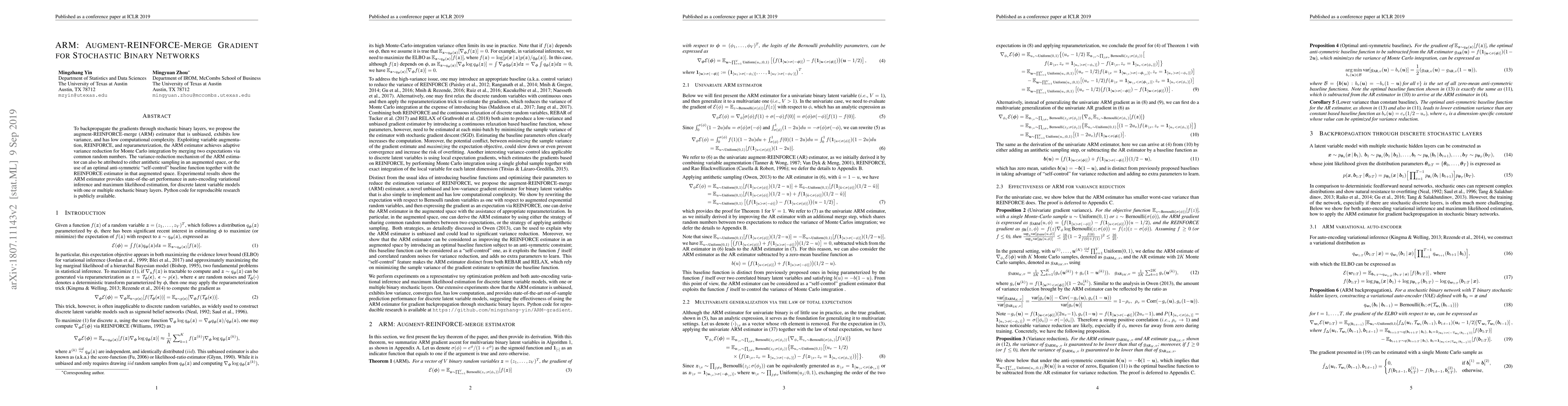 To backpropagate the gradients through stochastic binary layers, we propose the augment-REINFORCE-merge (ARM) estimator that is unbiased, exhibits low variance, and has low computational complexity. Exploiting variable augmentation, REINFORCE, and reparameterization, the ARM estimator achieves adaptive variance reduction for Monte Carlo integration by merging two expectations via common random numbers. The variance-reduction mechanism of the ARM estimator can also be attributed to either antithetic sampling in an augmented space, or the use of an optimal anti-symmetric "self-control" baseline function together with the REINFORCE estimator in that augmented space. Experimental results show the ARM estimator provides state-of-the-art performance in auto-encoding variational inference and maximum likelihood estimation, for discrete latent variable models with one or multiple stochastic binary layers. Python code for reproducible research is publicly available.