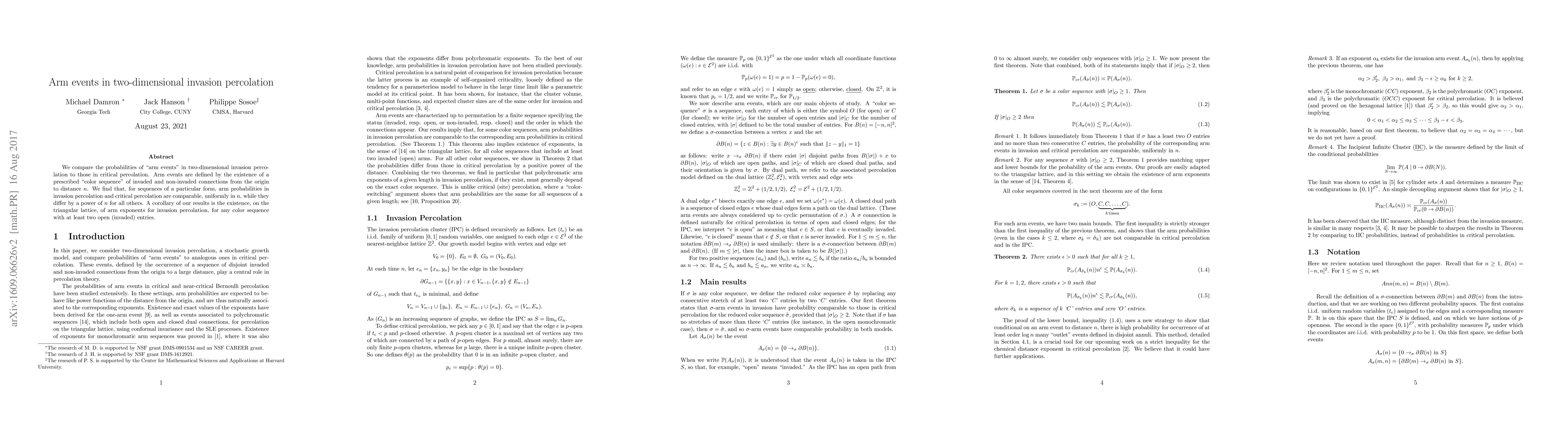 This paper compares arm event probabilities in two-dimensional invasion percolation to those in critical percolation, finding that for certain sequences, the probabilities are comparable, while for others they differ by a power of n. It concludes with the existence of arm exponents for invasion percolation on the triangular lattice for sequences with at least two open entries.