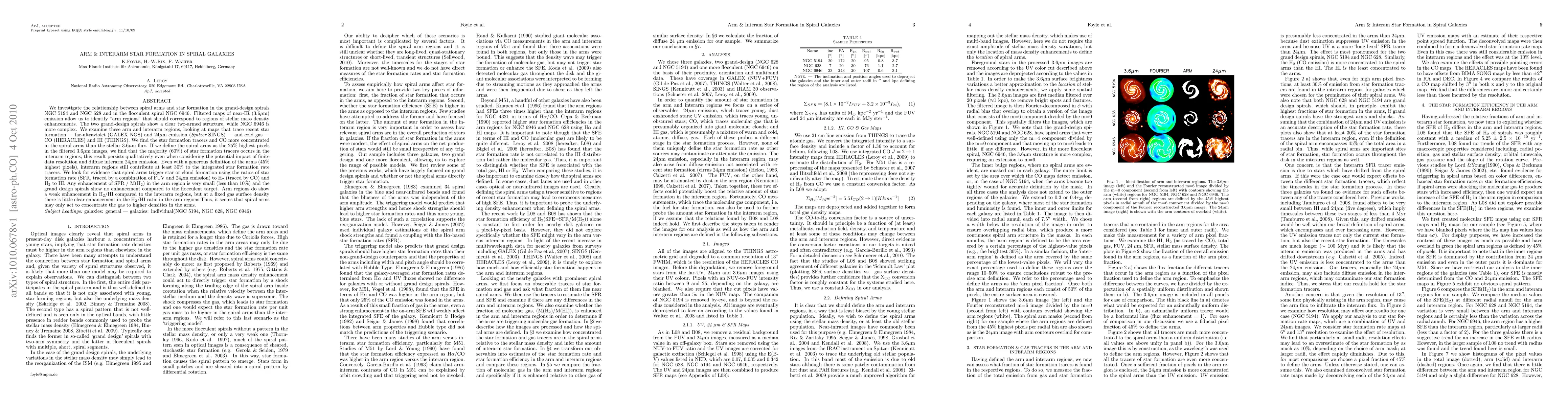 This study examines the star formation in spiral galaxies (NGC 5194, NGC 628, and NGC 6946) using near-IR and far-ultraviolet emissions, finding that most star formation occurs in interarm regions rather than within the arms themselves. While arms show some concentration of gas, they do not significantly enhance star formation rates.