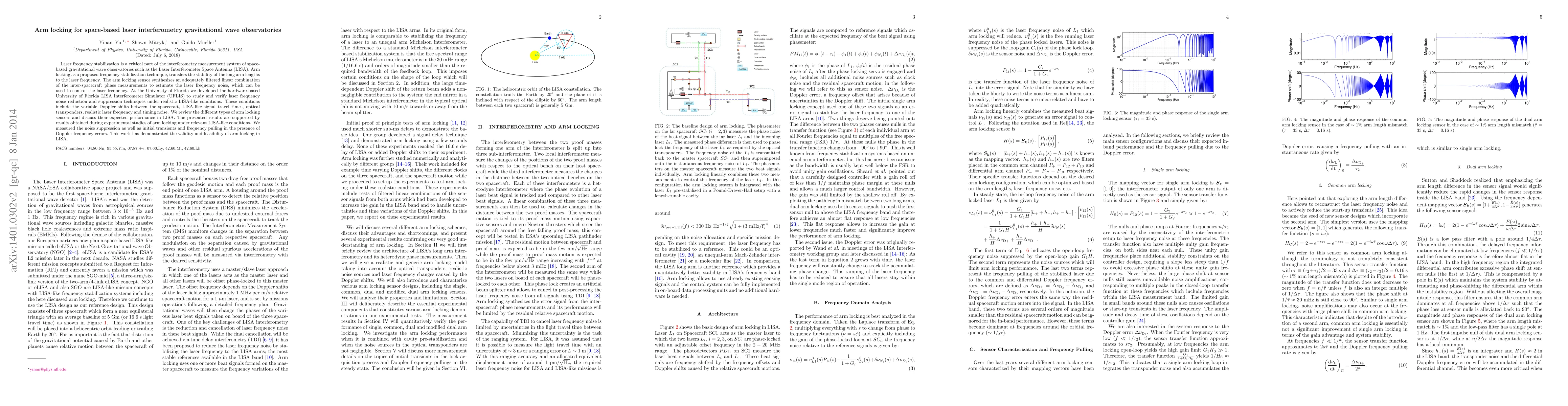 Laser frequency stabilization is a critical part of the interferometry measurement system of space-based gravitational wave observatories such as the Laser Interferometer Space Antenna (LISA). Arm locking as a proposed frequency stabilization technique, transfers the stability of the long arm lengths to the laser frequency. The arm locking sensor synthesizes an adequately filtered linear combination of the inter-spacecraft phase measurements to estimate the laser frequency noise, which can be used to control the laser frequency. At the University of Florida we developed the hardware-based University of Florida LISA Interferometer Simulator (UFLIS) to study and verify laser frequency noise reduction and suppression techniques under realistic LISA-like conditions. These conditions include the variable Doppler shifts between the spacecraft, LISA-like signal travel times, optical transponders, realistic laser frequency and timing noise. We review the different types of arm locking sensors and discuss their expected performance in LISA. The presented results are supported by results obtained during experimental studies of arm locking under relevant LISA-like conditions. We measured the noise suppression as well as initial transients and frequency pulling in the presence of Doppler frequency errors. This work has demonstrated the validity and \ feasibility of arm locking in LISA.