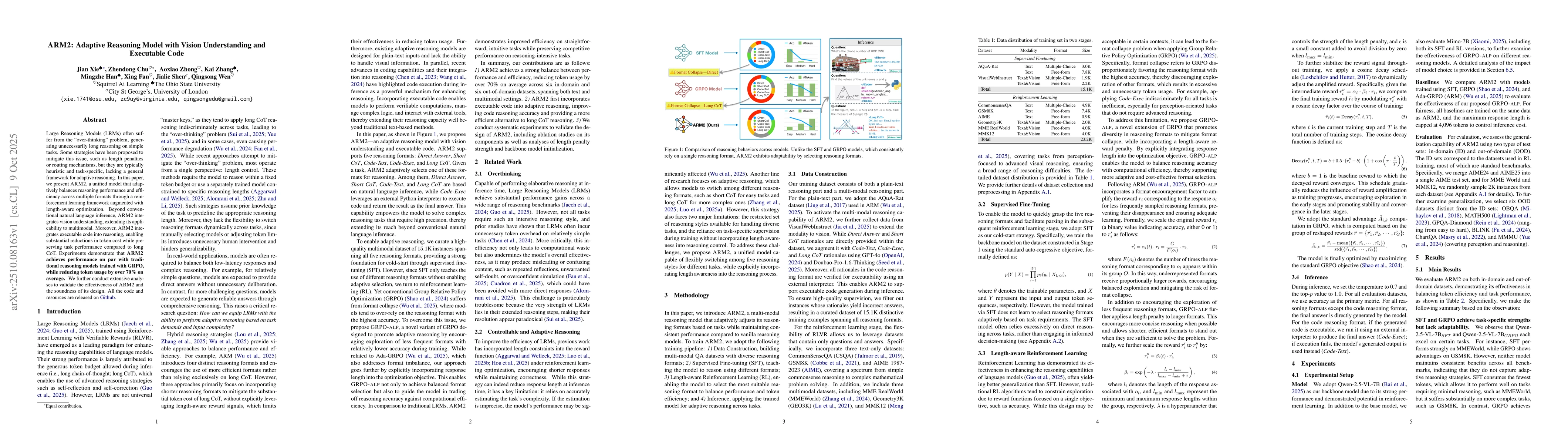 Large Reasoning Models (LRMs) often suffer from the ``over-thinking'' problem, generating unnecessarily long reasoning on simple tasks. Some strategies have been proposed to mitigate this issue, such as length penalties or routing mechanisms, but they are typically heuristic and task-specific, lacking a general framework for adaptive reasoning. In this paper, we present ARM2, a unified model that adaptively balances reasoning performance and efficiency across multiple formats through a reinforcement learning framework augmented with length-aware optimization. Beyond conventional natural language inference, ARM2 integrates vision understanding, extending its applicability to multimodal. Moreover, ARM2 integrates executable code into reasoning, enabling substantial reductions in token cost while preserving task performance compared to long CoT. Experiments demonstrate that ARM2 achieves performance on par with traditional reasoning models trained with GRPO, while reducing token usage by over 70% on average. We further conduct extensive analyses to validate the effectiveness of ARM2 and the soundness of its design.