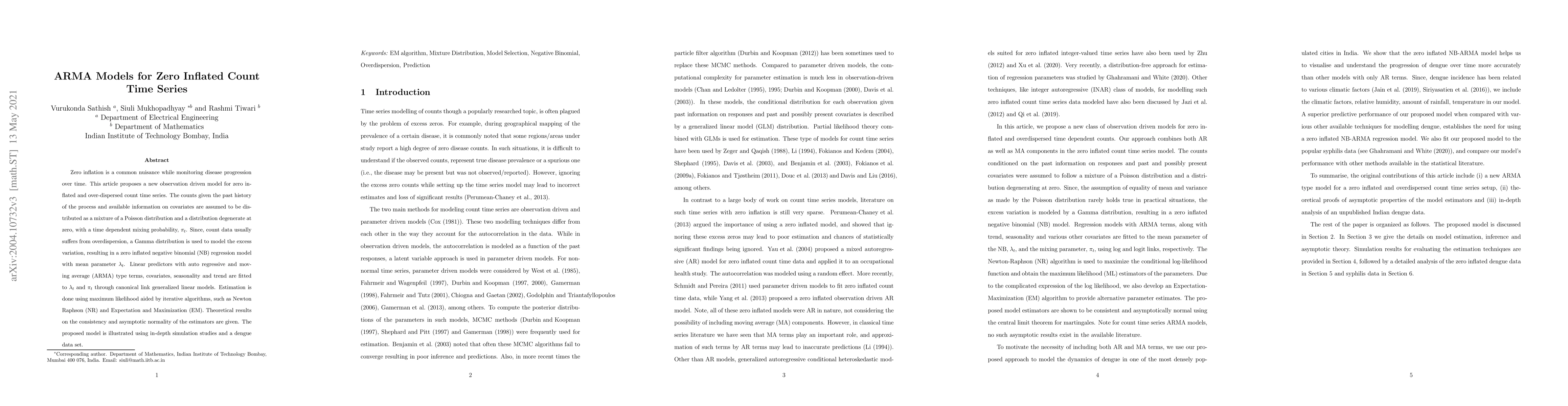 Zero inflation is a common nuisance while monitoring disease progression over time. This article proposes a new observation driven model for zero inflated and over-dispersed count time series. The counts given the past history of the process and available information on covariates is assumed to be distributed as a mixture of a Poisson distribution and a distribution degenerate at zero, with a time dependent mixing probability, $\pi_t$. Since, count data usually suffers from overdispersion, a Gamma distribution is used to model the excess variation, resulting in a zero inflated Negative Binomial (NB) regression model with mean parameter $\lambda_t$. Linear predictors with auto regressive and moving average (ARMA) type terms, covariates, seasonality and trend are fitted to $\lambda_t$ and $\pi_t$ through canonical link generalized linear models. Estimation is done using maximum likelihood aided by iterative algorithms, such as Newton Raphson (NR) and Expectation and Maximization (EM). Theoretical results on the consistency and asymptotic normality of the estimators are given. The proposed model is illustrated using in-depth simulation studies and a dengue data set.