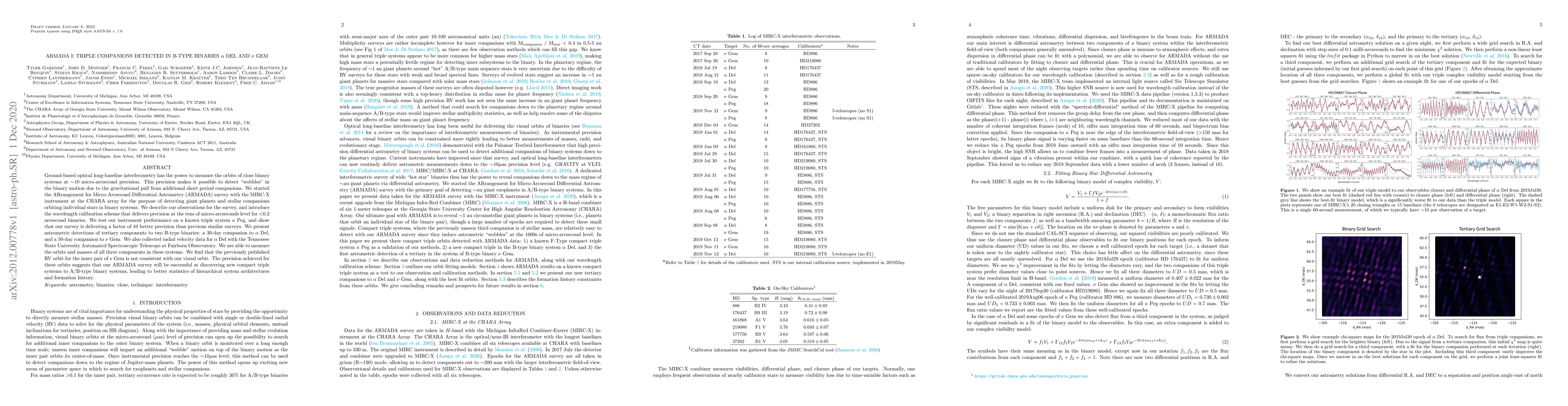 The ARMADA I survey using the MIRC-X instrument at the CHARA array detected tertiary companions in two B-type binary systems, alpha Del and nu Gem, with precision astrometry. This discovery enhances the understanding of hierarchical system architectures and formation history.