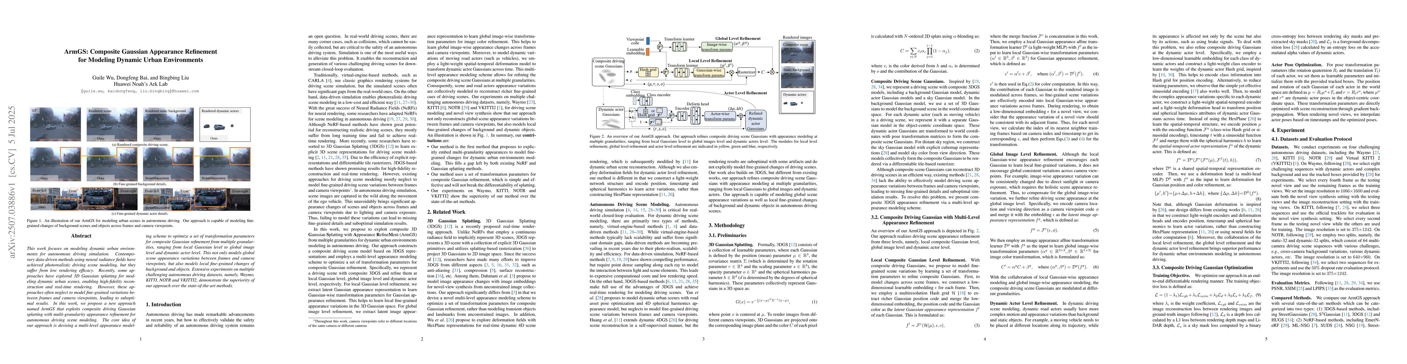 This work focuses on modeling dynamic urban environments for autonomous driving simulation. Contemporary data-driven methods using neural radiance fields have achieved photorealistic driving scene modeling, but they suffer from low rendering efficacy. Recently, some approaches have explored 3D Gaussian splatting for modeling dynamic urban scenes, enabling high-fidelity reconstruction and real-time rendering. However, these approaches often neglect to model fine-grained variations between frames and camera viewpoints, leading to suboptimal results. In this work, we propose a new approach named ArmGS that exploits composite driving Gaussian splatting with multi-granularity appearance refinement for autonomous driving scene modeling. The core idea of our approach is devising a multi-level appearance modeling scheme to optimize a set of transformation parameters for composite Gaussian refinement from multiple granularities, ranging from local Gaussian level to global image level and dynamic actor level. This not only models global scene appearance variations between frames and camera viewpoints, but also models local fine-grained changes of background and objects. Extensive experiments on multiple challenging autonomous driving datasets, namely, Waymo, KITTI, NOTR and VKITTI2, demonstrate the superiority of our approach over the state-of-the-art methods.