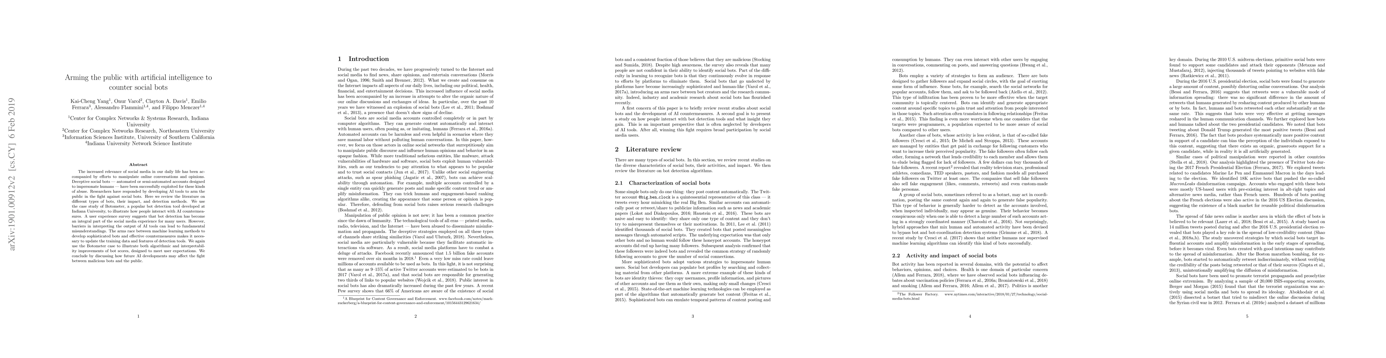 This paper reviews AI tools designed to detect deceptive social bots, highlighting the case study of Botometer. It discusses the evolving arms race between bot sophistication and detection methods, emphasizing the need for updated training data and interpretability to improve user understanding and effectiveness in countering social bots.