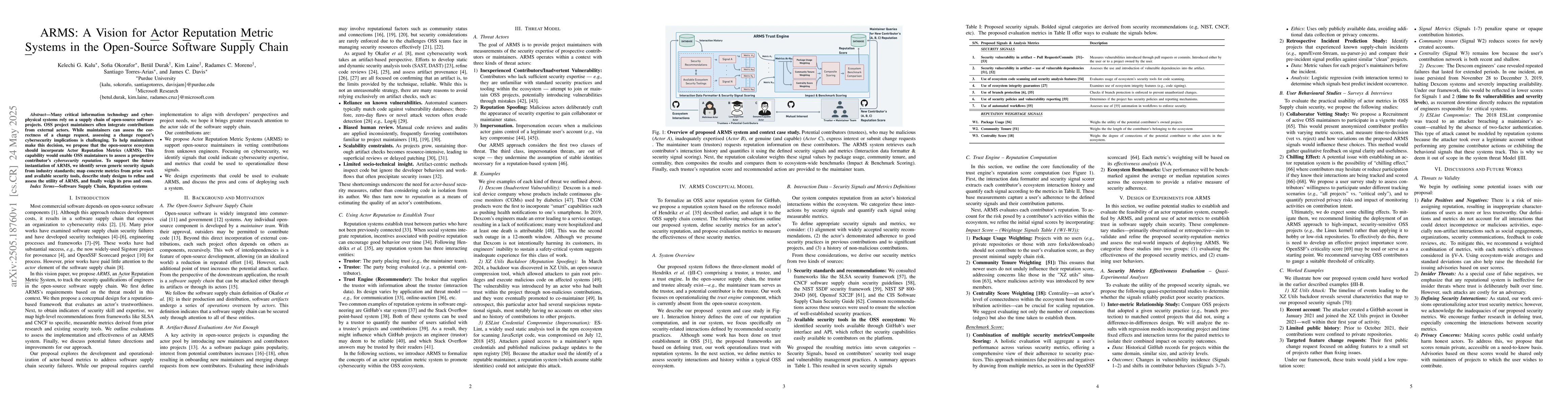 The paper proposes incorporating Actor Reputation Metric Systems (ARMS) into the open-source software supply chain to help maintainers assess cybersecurity implications of contributions. It identifies seven generic security signals, maps concrete metrics from prior work and security tools, and outlines study designs to refine and evaluate ARMS utility.