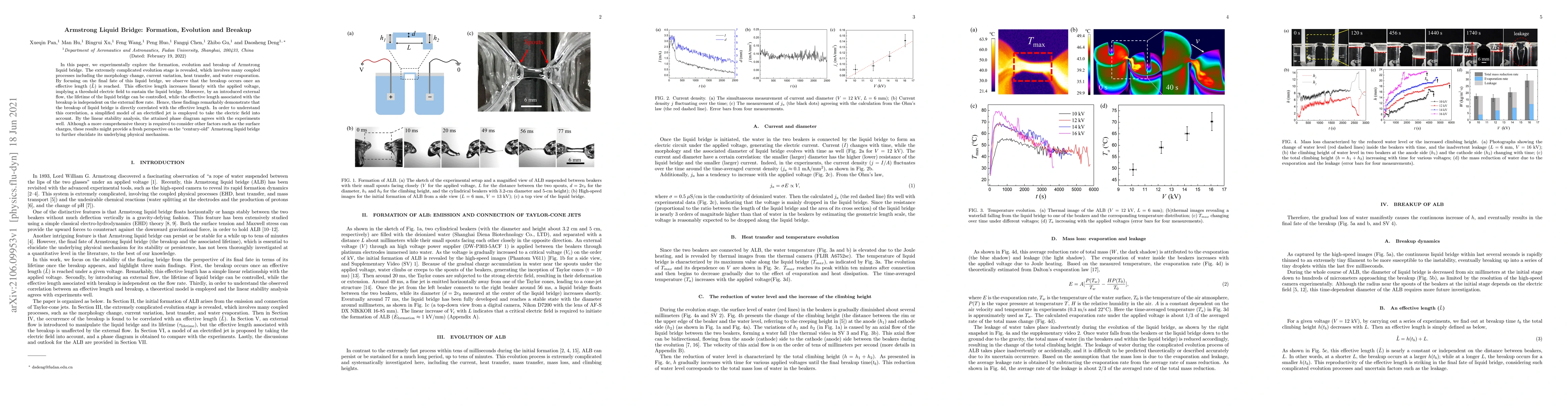 This paper experimentally investigates the formation, evolution, and breakup of Armstrong liquid bridges, revealing complex processes like morphology change and heat transfer. The study finds that the liquid bridge breaks up when an effective length is reached, which increases linearly with applied voltage, indicating a critical electric field. External flow can control the bridge's lifetime but does not affect the breakup length.