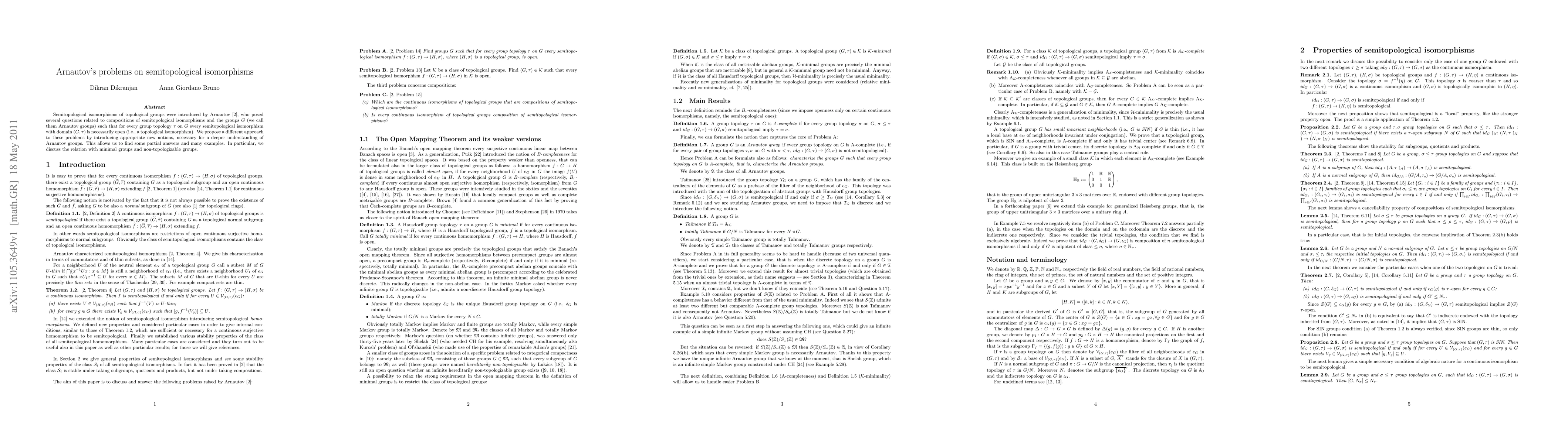 This paper introduces new concepts to address Arnautov's questions on semitopological isomorphisms in topological groups, providing partial answers and examples, and explores connections with minimal and non-topologizable groups.