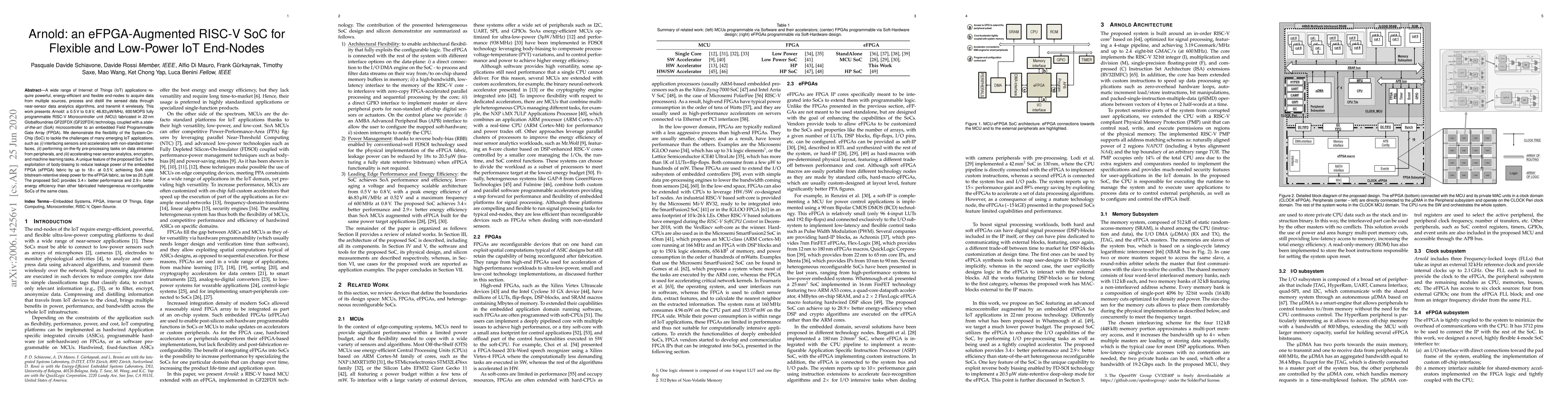 Arnold is a low-power, flexible RISC-V SoC augmented with an eFPGA for IoT applications, achieving up to 18x reduction in eFPGA leakage power via body-biasing, and outperforming other reconfigurable SoCs in performance and energy efficiency.
