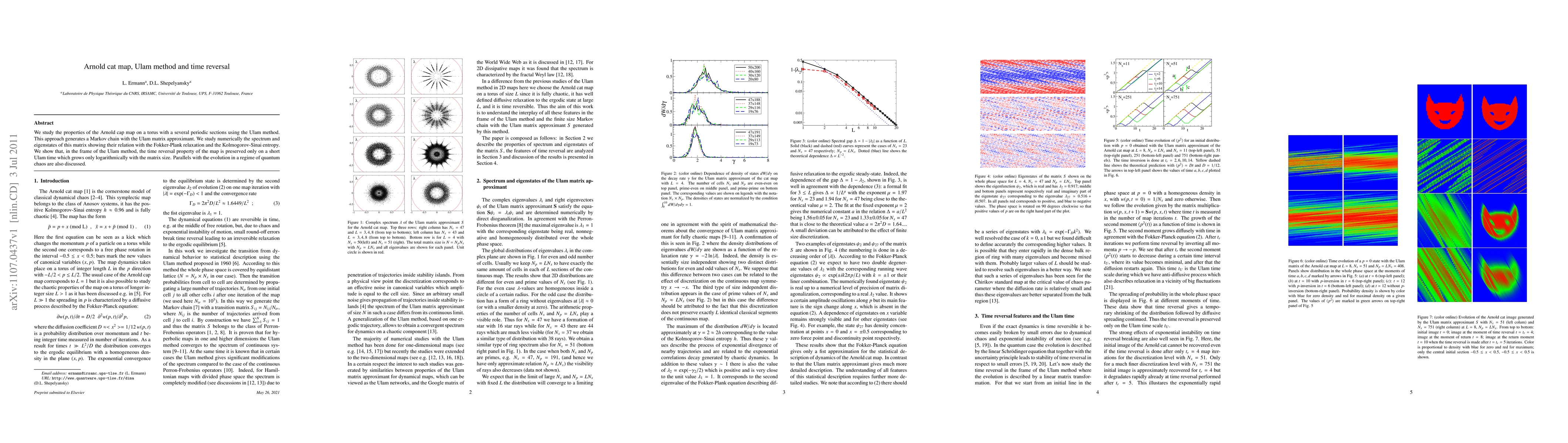 We study the properties of the Arnold cap map on a torus with a several periodic sections using the Ulam method. This approach generates a Markov chain with the Ulam matrix approximant. We study numerically the spectrum and eigenstates of this matrix showing their relation with the Fokker-Plank relaxation and the Kolmogorov-Sinai entropy. We show that, in the frame of the Ulam method, the time reversal property of the map is preserved only on a short Ulam time which grows only logarithmically with the matrix size. Parallels with the evolution in a regime of quantum chaos are also discussed.