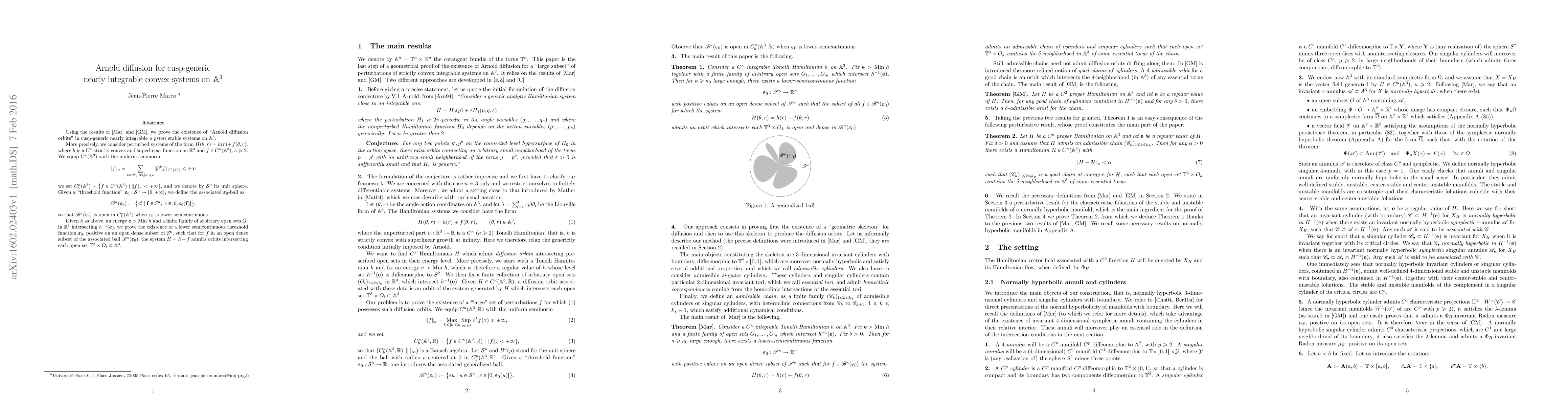Summary: This paper proves the existence of Arnold diffusion orbits in cusp-generic nearly integrable convex systems on ${\mathbb A}^3$, building on previous results about the existence of chains in such systems and diffusion orbits along those chains, in collaboration with M. Gidea.