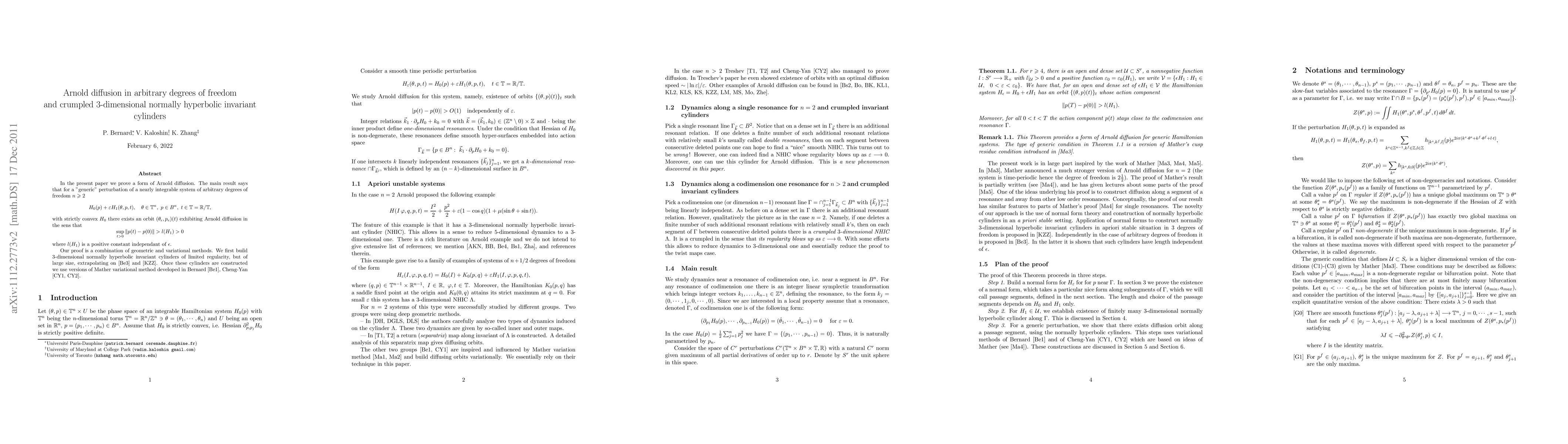 This paper proves Arnold diffusion for nearly integrable systems with arbitrary degrees of freedom, showing that perturbations lead to significant changes in momentum over time. The proof combines geometric and variational methods to construct large, irregular 3-dimensional hyperbolic cylinders and applies variational techniques to demonstrate the phenomenon.