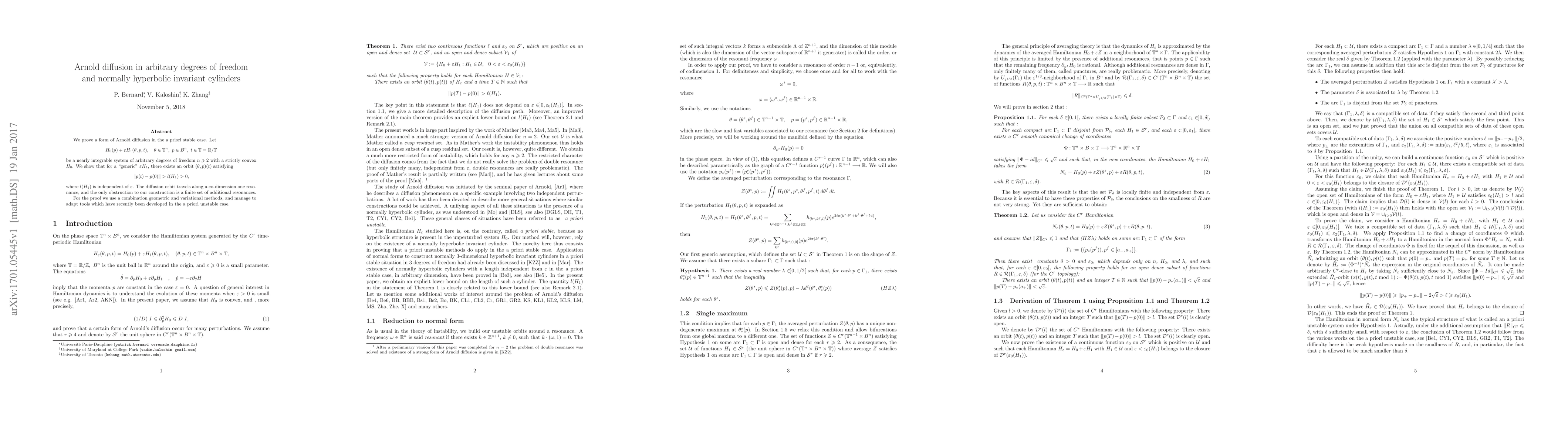 This paper proves Arnold diffusion in a nearly integrable system with arbitrary degrees of freedom, demonstrating that for a generic perturbation, orbits exhibit significant diffusion along a co-dimension one resonance. The proof utilizes geometric and variational methods adapted from tools developed for the a priori unstable case.