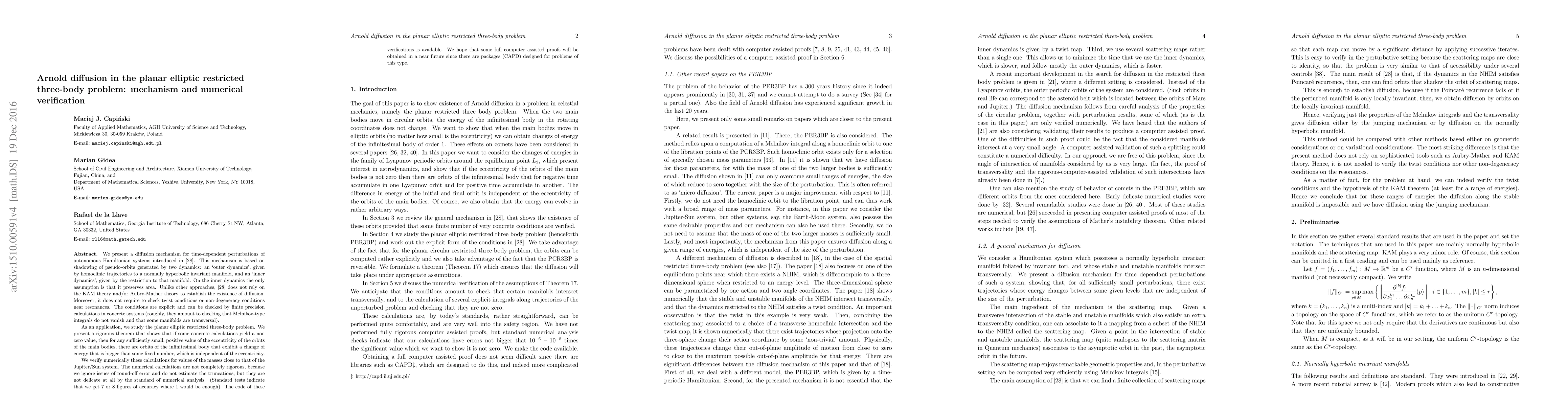 We present a diffusion mechanism for time-dependent perturbations of autonomous Hamiltonian systems introduced in [25]. This mechanism is based on shadowing of pseudo-orbits generated by two dynamics: an `outer dynamics', given by homoclinic trajectories to a normally hyperbolic invariant manifold, and an `inner dynamics', given by the restriction to that manifold. On the inner dynamics the only assumption is that it preserves area. Unlike other approaches, [25] does not rely on the KAM theory and/or Aubry-Mather theory to establish the existence of diffusion. Moreover, it does not require to check twist conditions or non-degeneracy conditions near resonances. The conditions are explicit and can be checked by finite precision calculations in concrete systems. As an application, we study the planar elliptic restricted three-body problem. We present a rigorous theorem that shows that if some concrete calculations yield a non zero value, then for any sufficiently small, positive value of the eccentricity of the orbits of the main bodies, there are orbits of the infinitesimal body that exhibit a change of energy that is bigger than some fixed number, which is independent of the eccentricity. We verify numerically these calculations for values of the masses close to that of the Jupiter/Sun system. The numerical calculations are not completely rigorous, because we ignore issues of round-off error and do not estimate the truncations, but they are not delicate at all by the standard of numerical analysis. (Standard tests indicate that we get 7 or 8 figures of accuracy where 1 would be enough). The code of this verifications is available. We hope that some full computer assisted proofs will be obtained in a near future since there are packages (CAPD) designed for problems of this type.