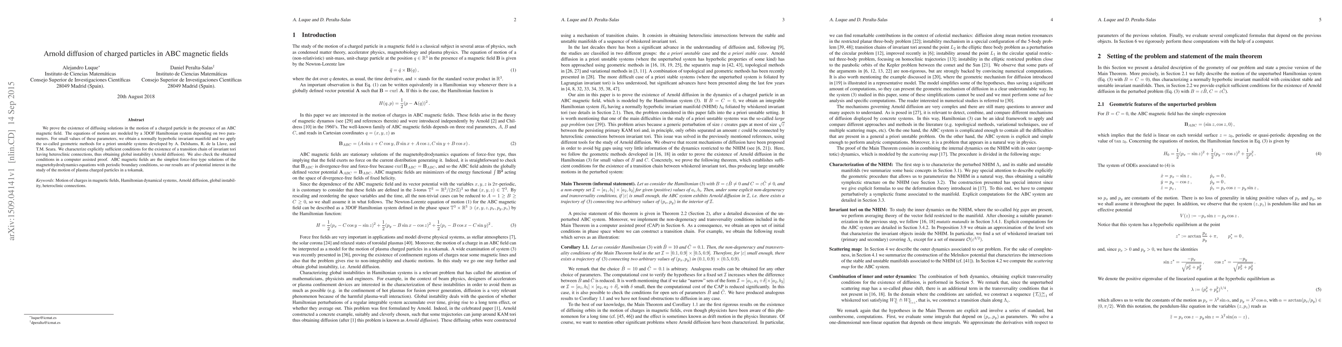 This paper proves the existence of Arnold diffusion in the motion of charged particles under ABC magnetic fields, modeled by a 3DOF Hamiltonian system. Using geometric methods, it characterizes conditions for the transition chain of invariant tori and verifies these conditions via computer-assisted proof, with implications for plasma physics in tokamak devices.