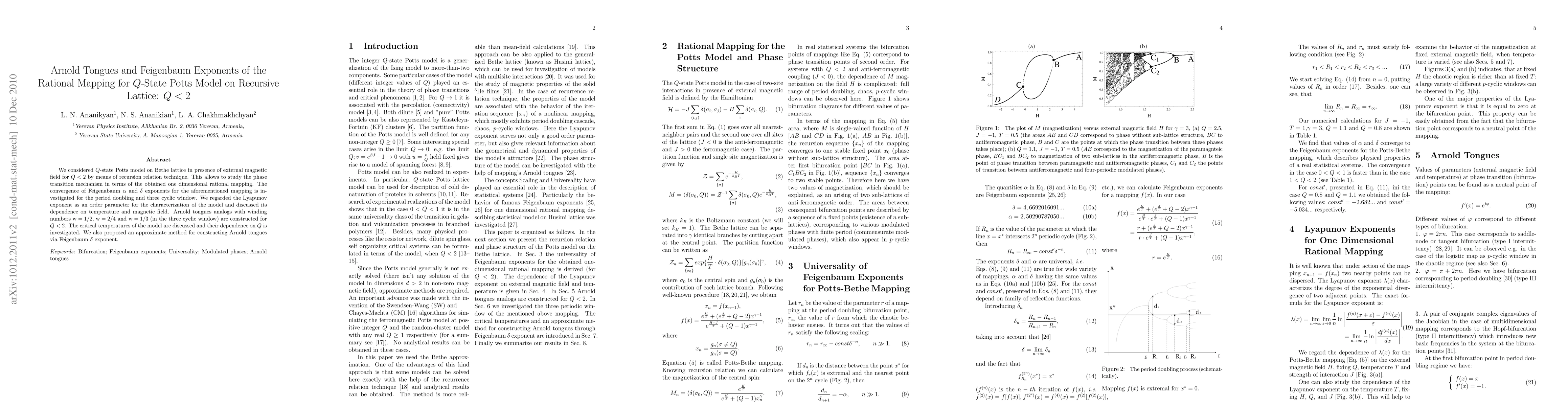 We considered Q-state Potts model on Bethe lattice in presence of external magnetic field for Q<2 by means of recursion relation technique. This allows to study the phase transition mechanism in terms of the obtained one dimensional rational mapping. The convergence of Feigenabaum $\alpha$ and $\delta$ exponents for the aforementioned mapping is investigated for the period doubling and three cyclic window. We regarded the Lyapunov exponent as an order parameter for the characterization of the model and discussed its dependence on temperature and magnetic field. Arnold tongues analogs with winding numbers w=1/2, w=2/4 and w=1/3 (in the three cyclic window) are constructed for Q<2. The critical temperatures of the model are discussed and their dependence on Q is investigated. We also proposed an approximate method for constructing Arnold tongues via Feigenbaum $\delta$ exponent.