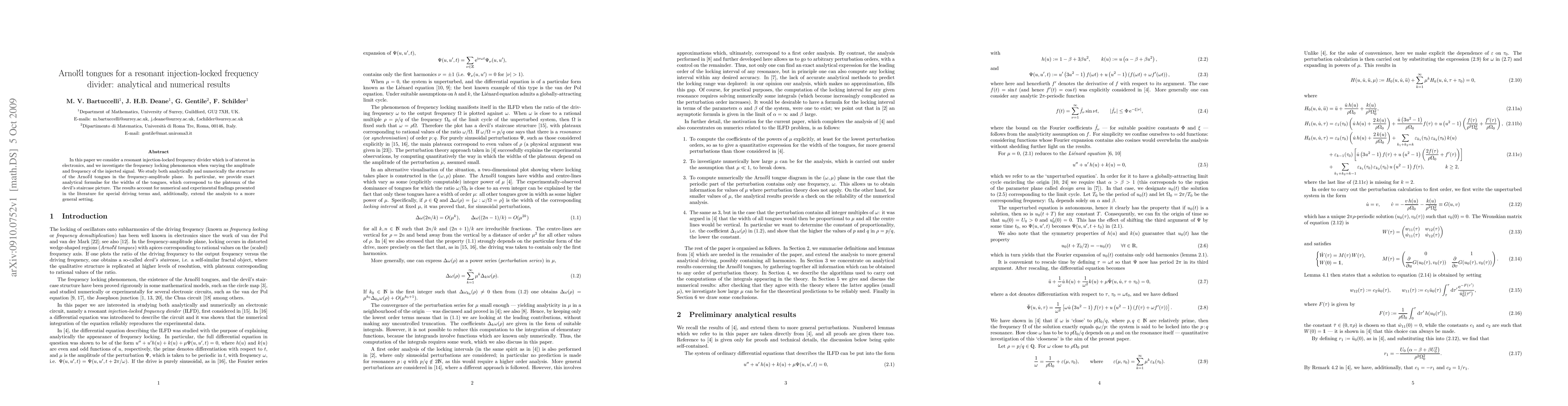 This paper investigates the frequency locking behavior in a resonant injection-locked frequency divider, analyzing the structure of Arnold tongues both analytically and numerically. It provides exact formulae for the widths of these tongues, extending the analysis to a broader context and aligning with existing numerical and experimental results.