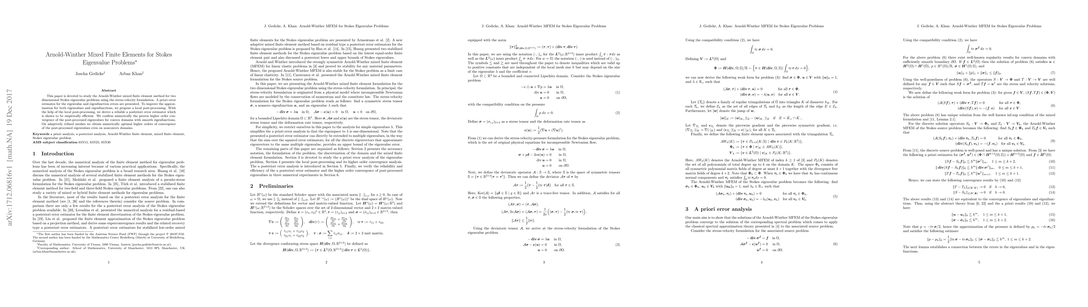 This paper explores the Arnold-Winther mixed finite element method for two-dimensional Stokes eigenvalue problems, presenting a priori error estimates and proposing local post-processing to enhance accuracy. Numerically, it confirms higher-order convergence of post-processed eigenvalues, achieving optimal convergence rates on adaptively refined meshes.