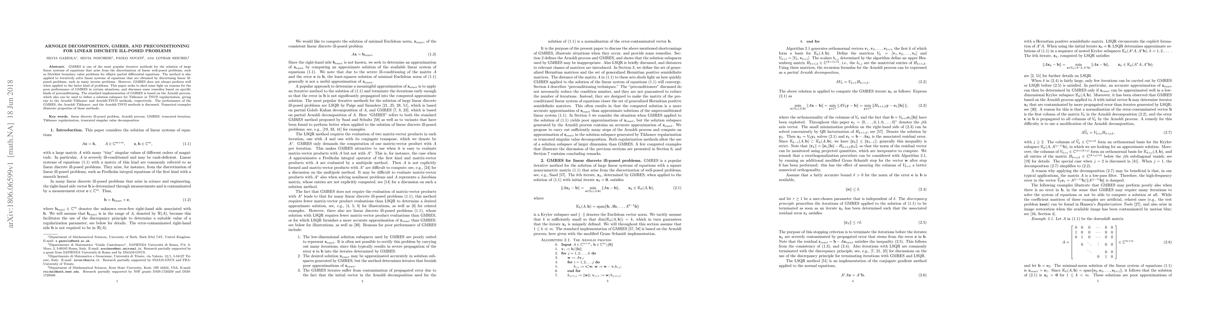 The paper analyzes GMRES and the Arnoldi algorithm for regularizing large-scale linear ill-posed problems, deriving theoretical properties involving the distance of the original coefficient matrix to classes of generalized Hermitian matrices.