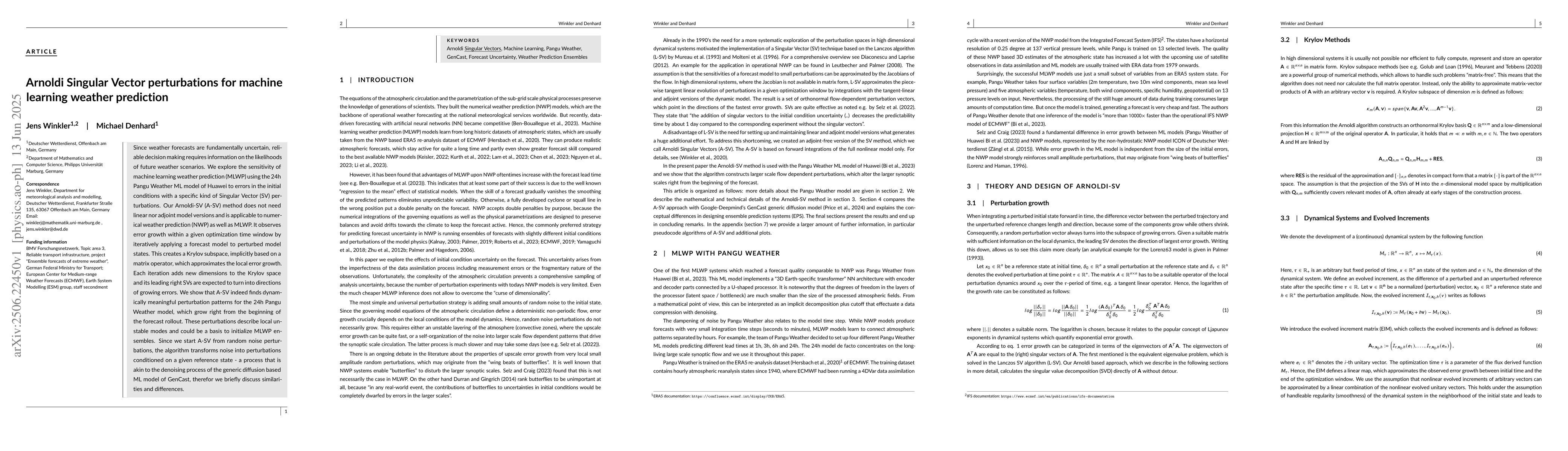 Since weather forecasts are fundamentally uncertain, reliable decision making requires information on the likelihoods of future weather scenarios. We explore the sensitivity of machine learning weather prediction (MLWP) using the 24h Pangu Weather ML model of Huawei to errors in the initial conditions with a specific kind of Singular Vector (SV) perturbations. Our Arnoldi-SV (A-SV) method does not need linear nor adjoint model versions and is applicable to numerical weather prediction (NWP) as well as MLWP. It observes error growth within a given optimization time window by iteratively applying a forecast model to perturbed model states. This creates a Krylov subspace, implicitly based on a matrix operator, which approximates the local error growth. Each iteration adds new dimensions to the Krylov space and its leading right SVs are expected to turn into directions of growing errors. We show that A-SV indeed finds dynamically meaningful perturbation patterns for the 24h Pangu Weather model, which grow right from the beginning of the forecast rollout. These perturbations describe local unstable modes and could be a basis to initialize MLWP ensembles. Since we start A-SV from random noise perturbations, the algorithm transforms noise into perturbations conditioned on a given reference state - a process that is akin to the denoising process of the generic diffusion based ML model of GenCast, therefor we briefly discuss similarities and differences.