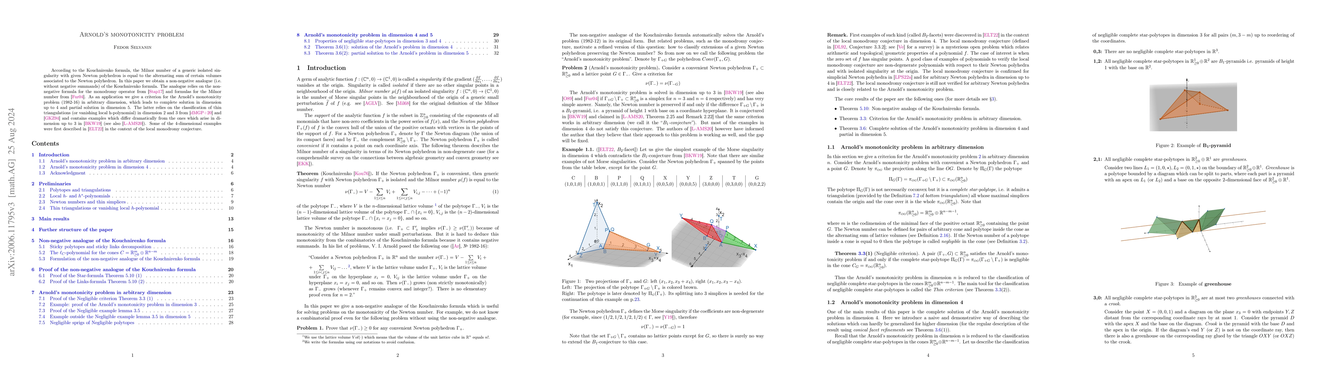 This paper presents a non-negative analogue of the Kouchnirenko formula, solving Arnold's monotonicity problem in dimensions up to 4 by relying on prior works on monodromy operators and Milnor numbers. It also introduces new examples in dimension 4 differing significantly from lower dimensions.