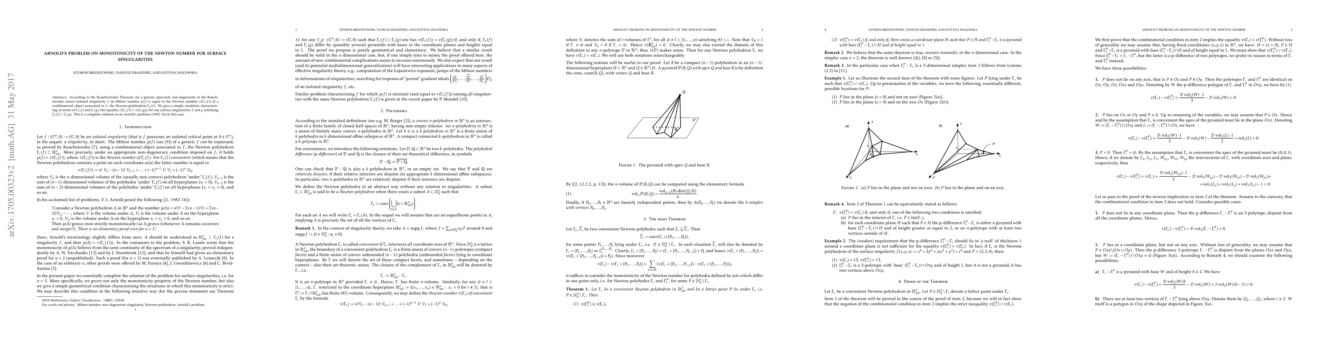 This paper provides a simple condition for the equality of Newton numbers for the Milnor numbers of generic isolated surface singularities, solving Arnold's problem regarding monotonicity when the Newton polyhedron of one singularity is contained within the other.
