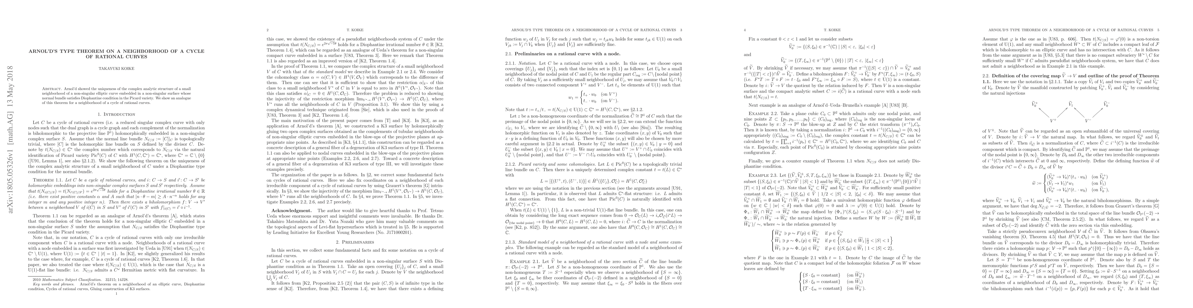 Arnol'd showed the uniqueness of the complex analytic structure of a small neighborhood of a non-singular elliptic curve embedded in a non-singular surface whose normal bundle satisfies Diophantine condition in the Picard variety. We show an analogue of this theorem for a neighborhood of a cycle of rational curves.