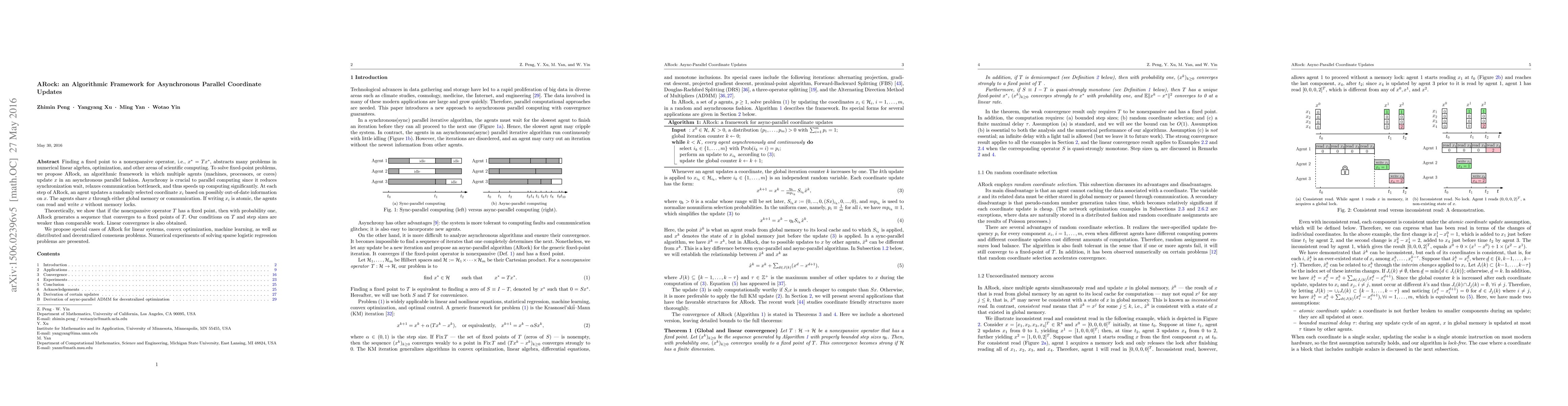 The paper proposes ARock, an algorithmic framework for asynchronous parallel coordinate updates to find a fixed point of a nonexpansive operator, crucial in numerical linear algebra, optimization, and scientific computing. It details an asynchronous parallel method where agents update coordinates based on possibly outdated information, utilizing global memory or communication for sharing.