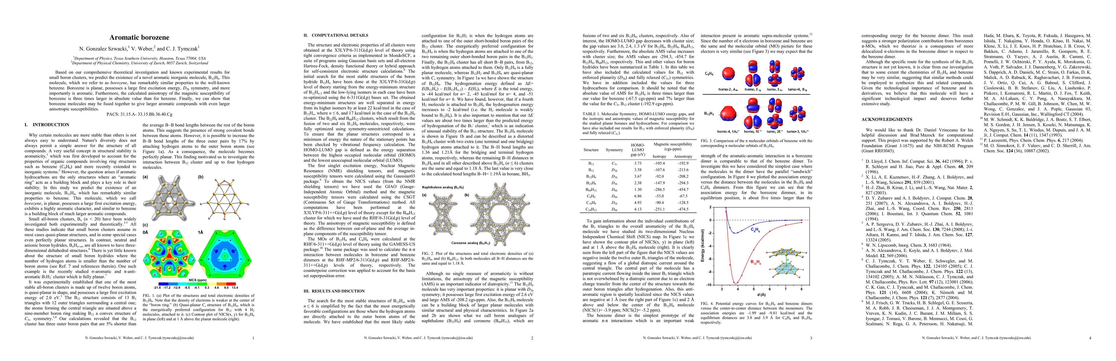 Based on our comprehensive theoretical investigation and known experimental results for small boron clusters, we predict the existence of a novel aromatic inorganic molecule, B12H6. This molecule, which we refer to as borozene, has remarkably similar properties to the well-known benzene. Borozene is planar, possesses a large first excitation energy, D3h symmetry, and more importantly is aromatic. Furthermore, the calculated anisotropy of the magnetic susceptibility of borozene is three times larger in absolute value than for benzene. Finally, we can show that borozene molecules may be fused together to give larger aromatic compounds with even larger anisotropic susceptibilities.