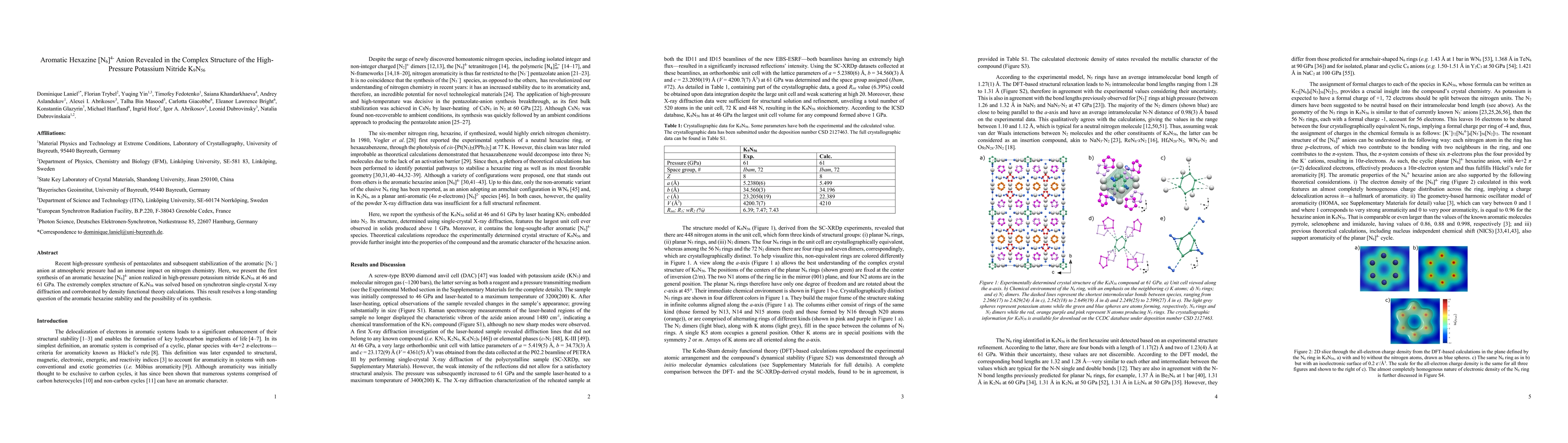 This research reveals the first synthesis of an aromatic hexazine [N6]4- anion in high-pressure potassium nitride K9N56 at 46 and 61 GPa, solving its complex structure via synchrotron single-crystal X-ray diffraction and DFT calculations, thus answering a long-standing question on aromatic hexazine stability and synthesis.