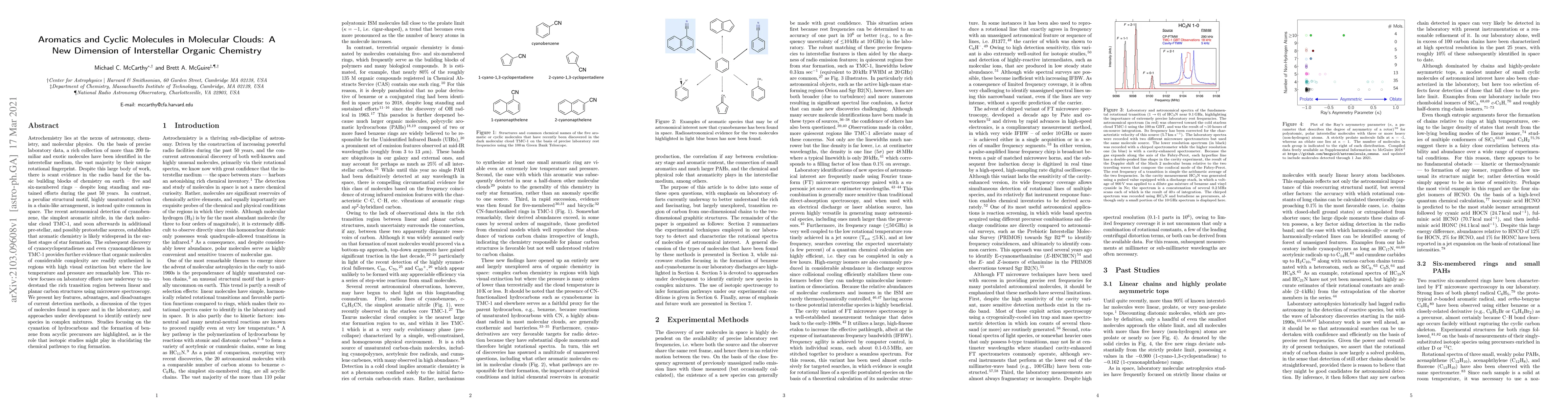 This paper explores the detection and synthesis of aromatic and cyclic molecules in molecular clouds, highlighting the recent astronomical identification of cyanobenzene and more complex aromatic nitriles. It discusses the transition from linear to planar carbon structures and the potential pathways for forming aromatic compounds in low-temperature interstellar environments.