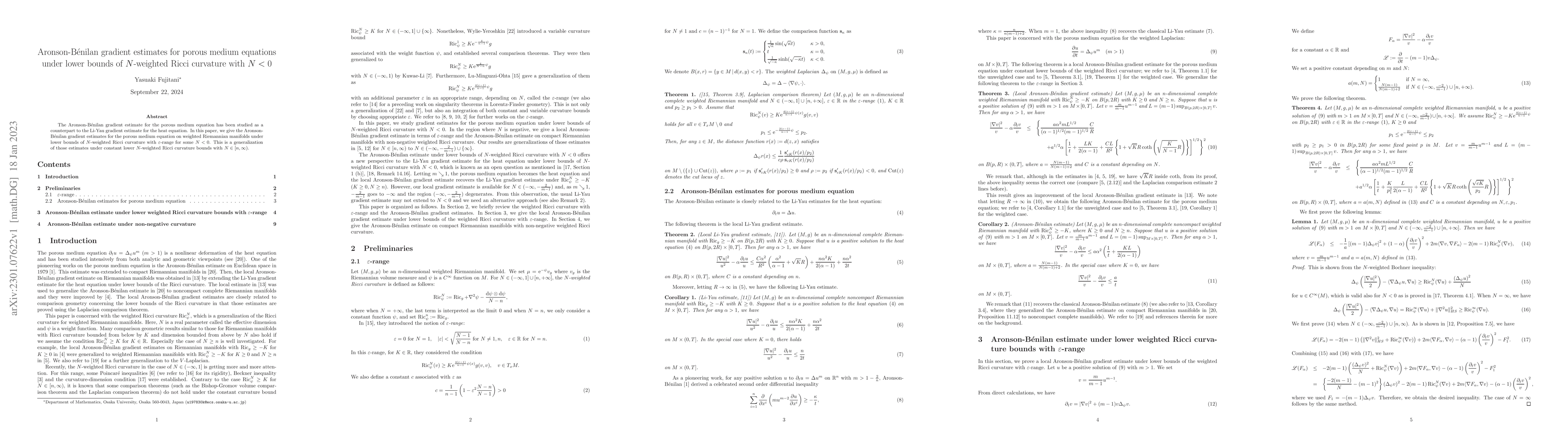 The Aronson-B\'enilan gradient estimate for the porous medium equation has been studied as a counterpart to the Li-Yau gradient estimate for the heat equation. In this paper, we give the Aronson-B\'{e}nilan gradient estimates for the porous medium equation on weighted Riemannian manifolds under lower bounds of $N$-weighted Ricci curvature with $\varepsilon$-range for some $N < 0$. This is a generalization of those estimates under constant lower $N$-weighted Ricci curvature bounds with $N\in [n,\infty)$.