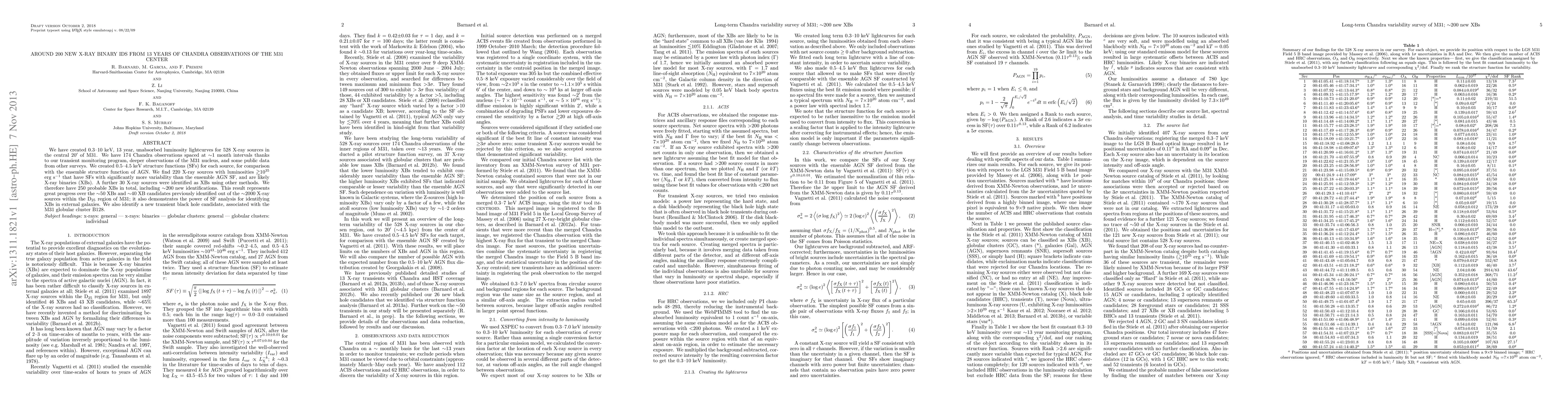 This study identifies around 200 new X-ray binary sources in the M31 center using 13 years of Chandra observations, significantly increasing the previous count of X-ray binaries. The analysis employs structure functions to distinguish these binaries from active galactic nuclei, revealing notable variability in the new sources.
